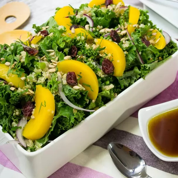 Mix de lechugas, serrano, mozzarella, durazno, aceite de oliva y balsámico