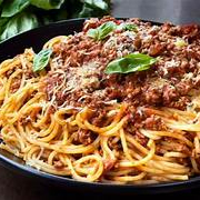 Pasta con salsa pomodoro, carne al vino tinto y parmesano