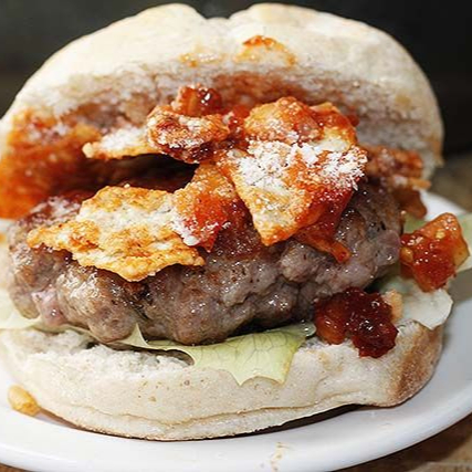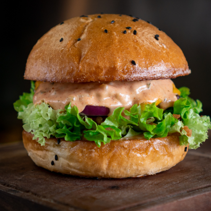 Carne de res, tocino, queso, lechuga, jitomate, cebolla