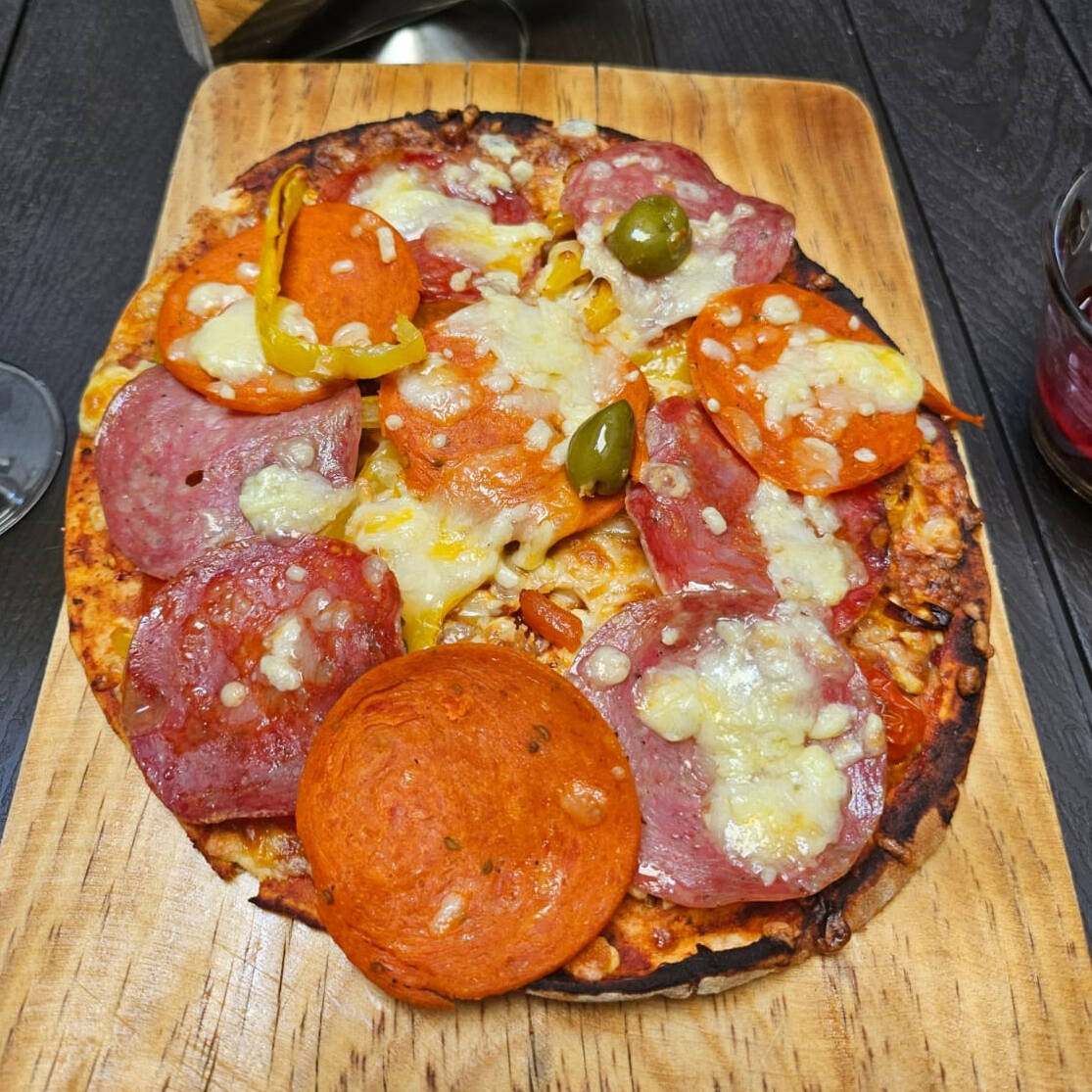 salsa pomodoro con mezcla de quesos, chorizo pamplona, salami, peperoni, champiñon, cherry aceituna y pimiento
