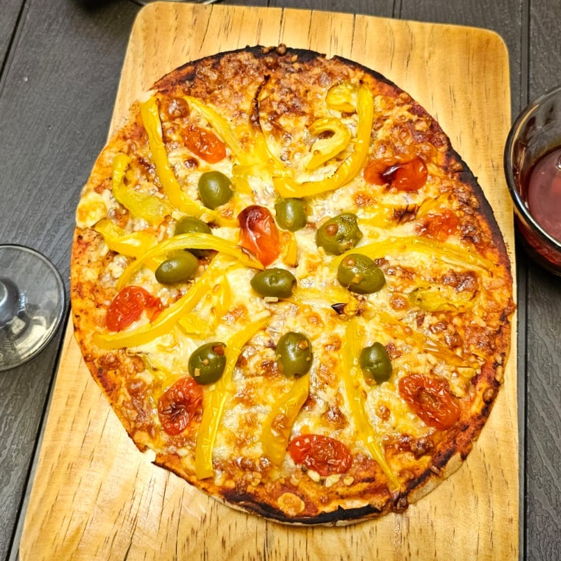 salsa pomodoro con mezcla de quesos, cherry, pimientos, champiñon y aceitunas