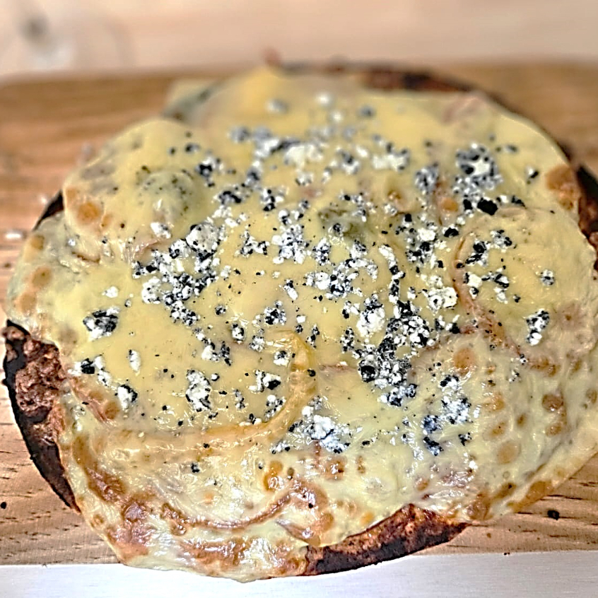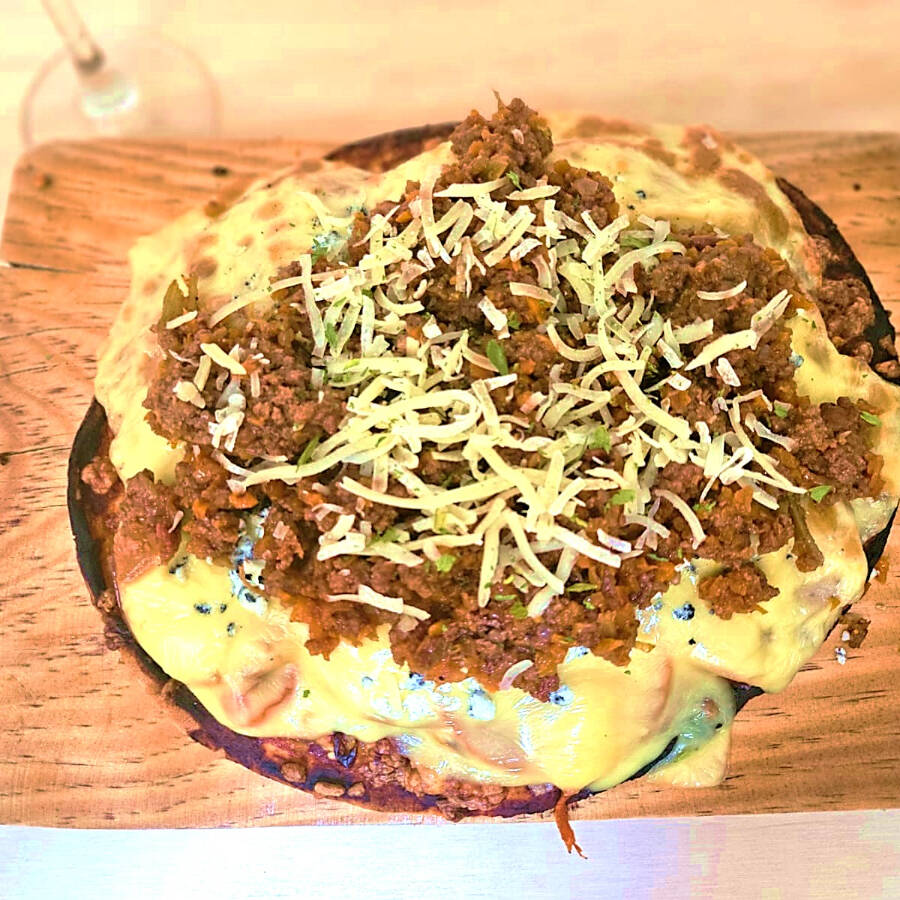 Champiñón, cebolla caramelizada, serrano, costra de Oaxaca, verduras