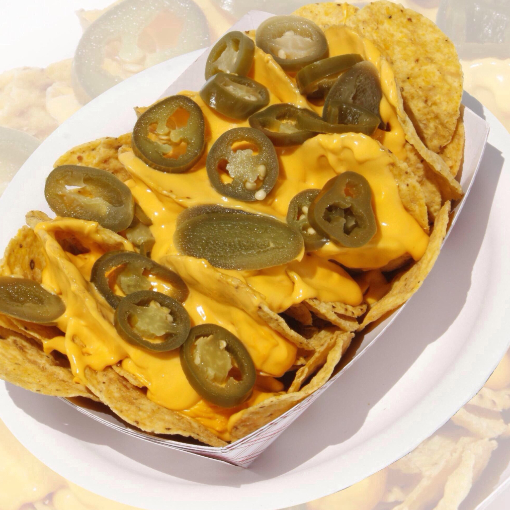 Totopos con queso cheddar fundido, jalapeños y pico de gallo