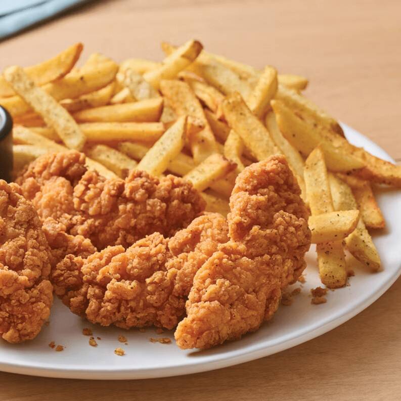 5 tiras de pollo empanizadas con papas chips salsas a elegir (BBQ, Buffalo, Mango habanero, Lemon pepper)