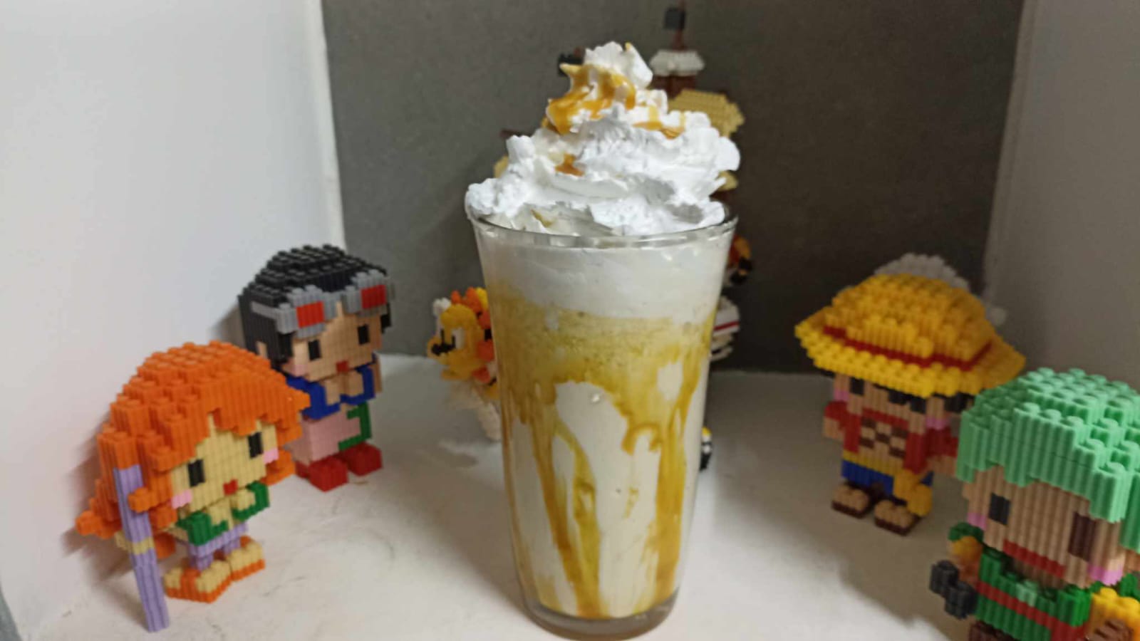 Hielo molido, con leche, saborizante, crema batida, granillo de chocolate y jarabe.