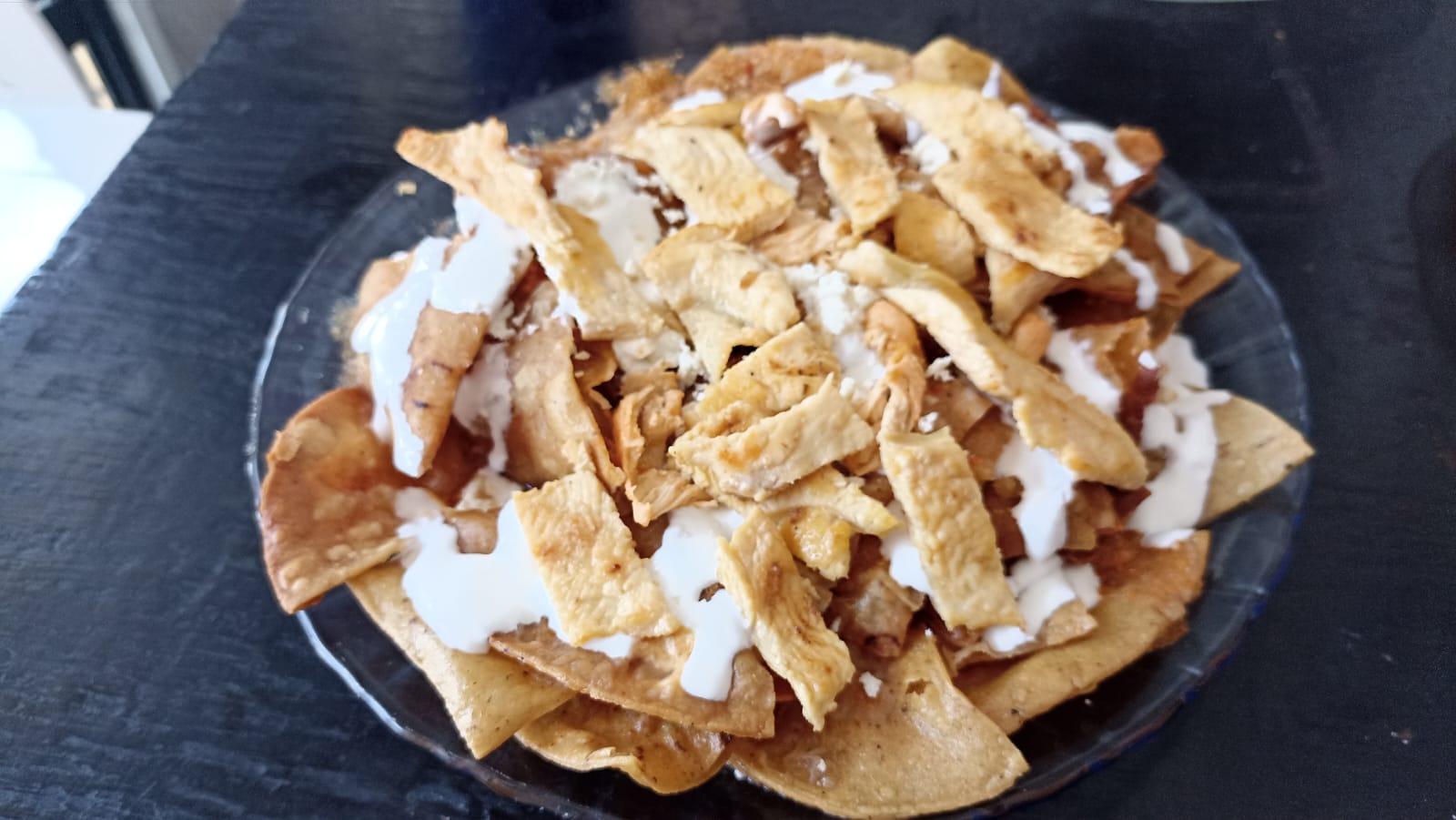 Tortilla frita con salsa de jitomate y tomate, con pollo, crema, queso y cebolla.