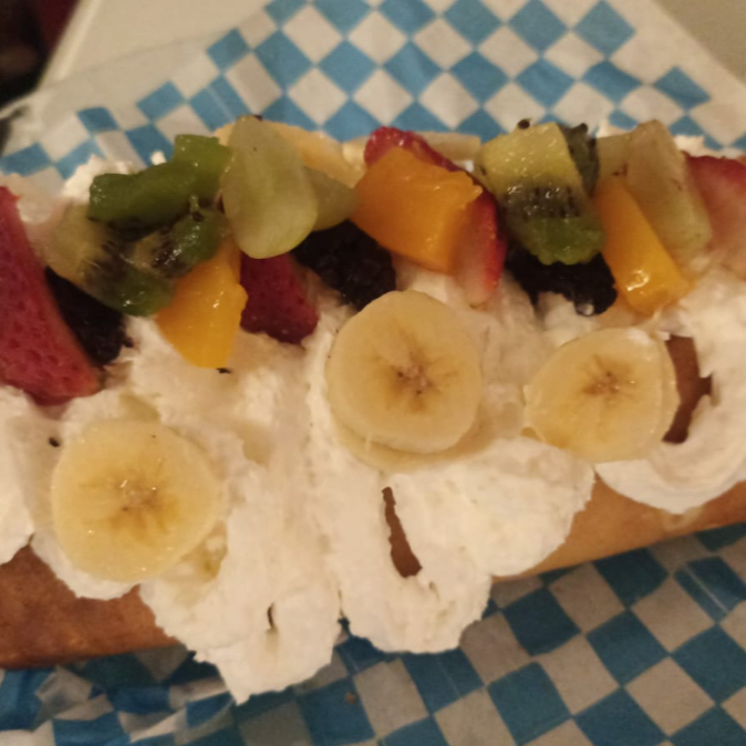 Crepé rellena de fruta, helado y crema batids(durazno, plátano, kiwi, zarzamora, fresa y uva)
