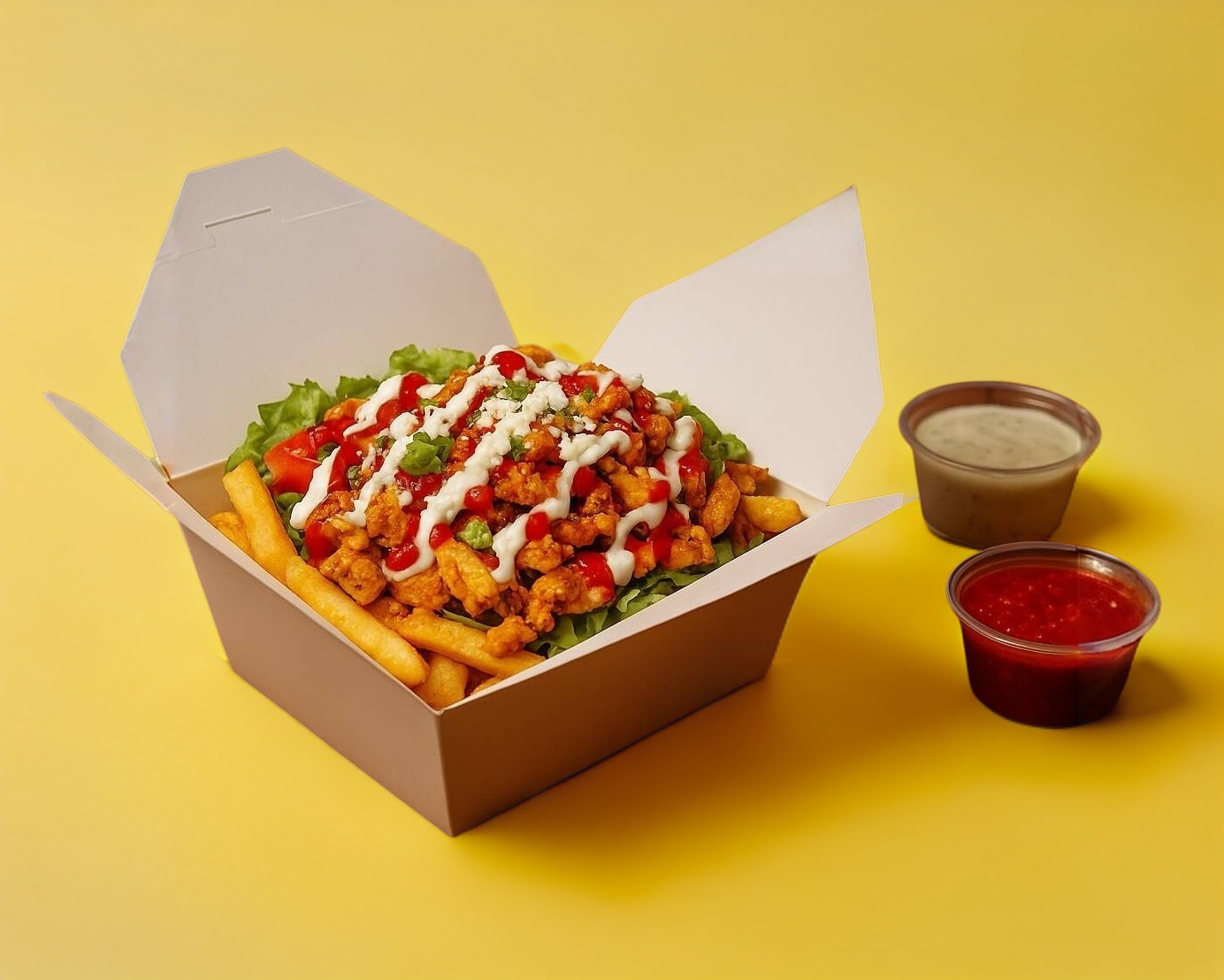 La versión compacta del kebab bowl. una porción ideal para el antojo rápido.jugosa carne de pollo (110gr.), asada lentamente en un trompo y marinada con nuestra receta especial, servida en un box con crujientes papas fritas (frescas verduras, lechuga, jitomate, pepino) y la salsa de tu elección.