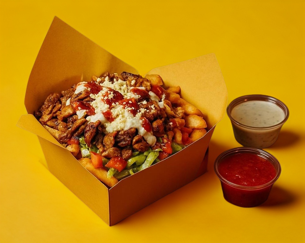 La versión compacta del kebab bowl. una porción ideal para el antojo rápido.jugosa carne de res (110gr.), asada lentamente en un trompo y marinada con nuestra receta especial, servida en un box con crujientes papas fritas (frescas verduras, lechuga, jitomate, pepino) y la salsa de tu elección.