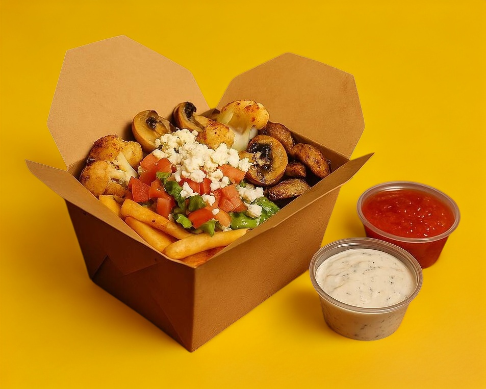 La versión compacta del kebab bowl. una porción ideal para el antojo rápido.exquisita coliflor y champiñones (110gr.), asada a la perfección y marinada con nuestra receta especial, servida en un box con crujientes papas fritas (frescas verduras, lechuga, jitomate, pepino) y la salsa de tu elección.