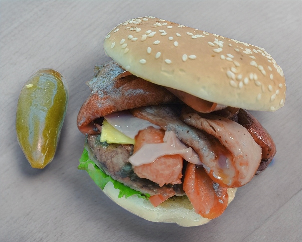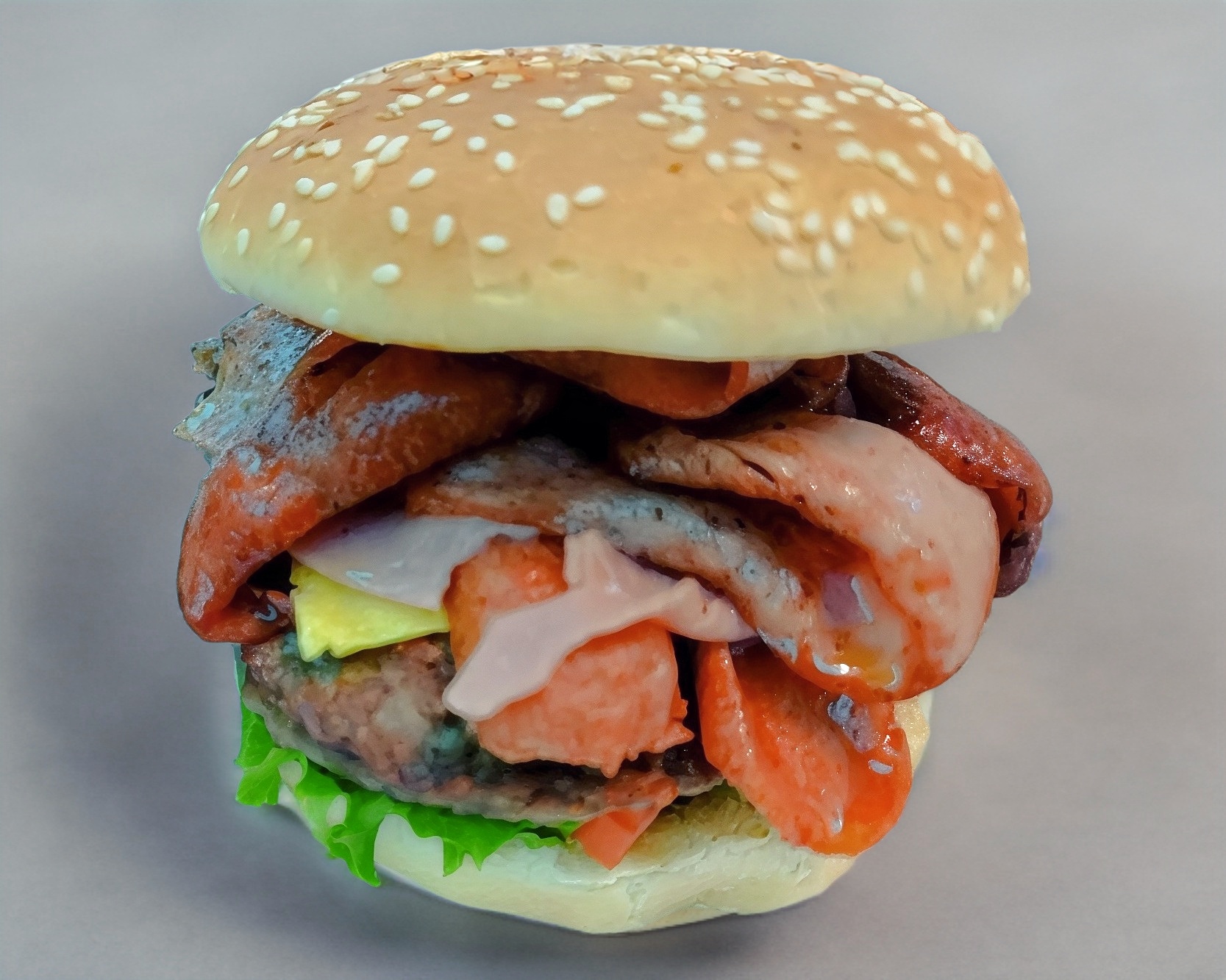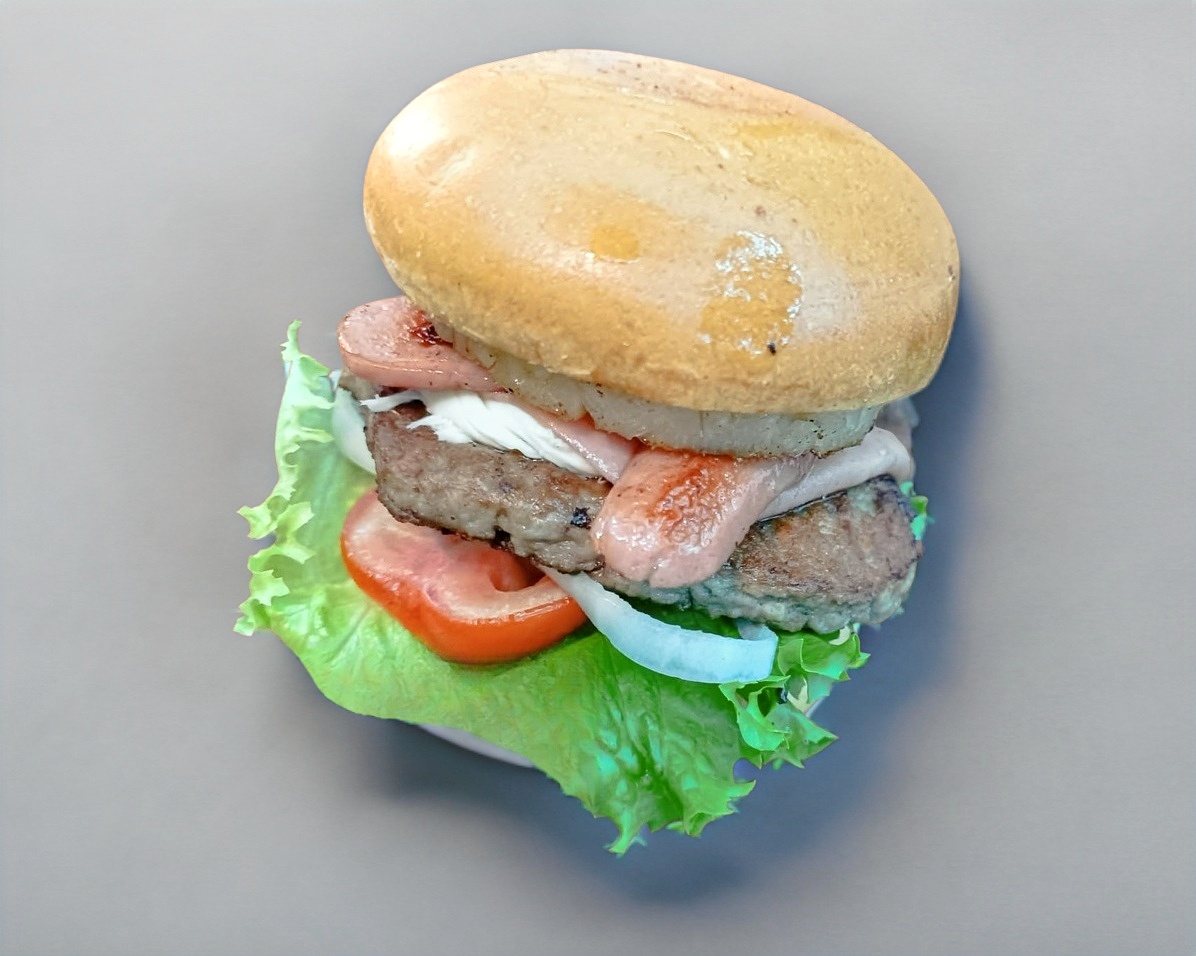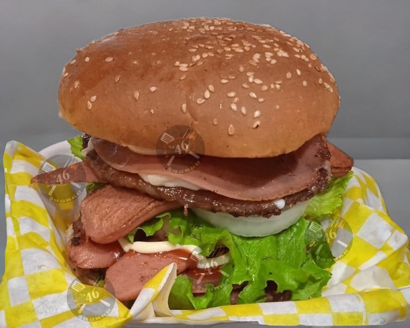 Hamburguesa de arrachera con doble carne, doble salchicha, doble jamón ,doble queso amarillo y doble queso oaxaca. (No incluye papas)