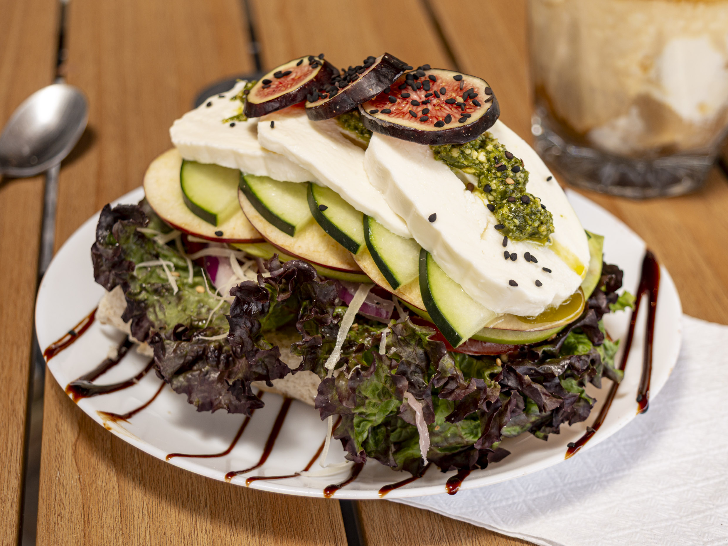Rodajas de jitomate y queso mozzarella sobre una cama de lechuga pesto de albahaca y crema balsámica de frutos rojos.