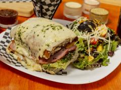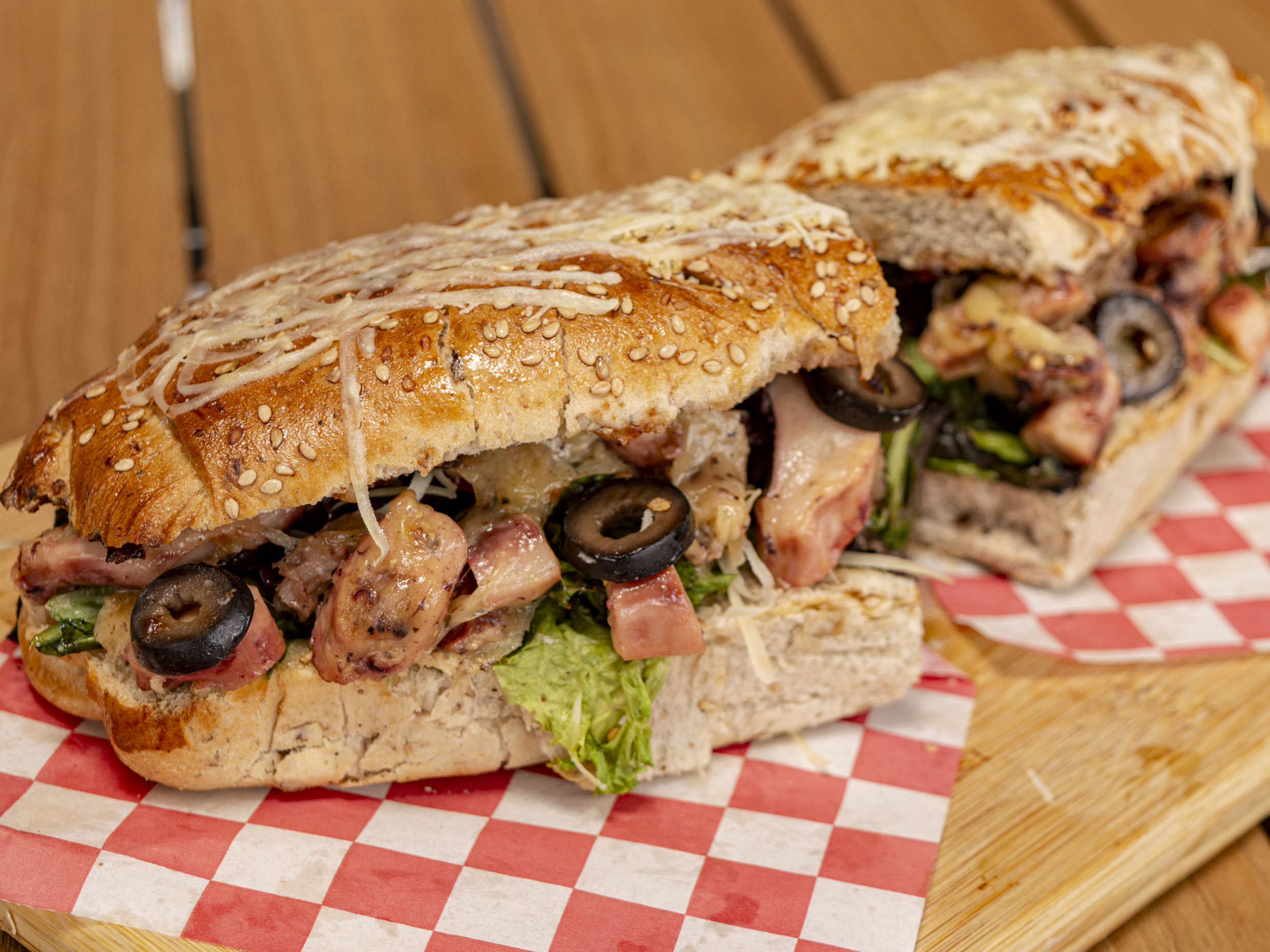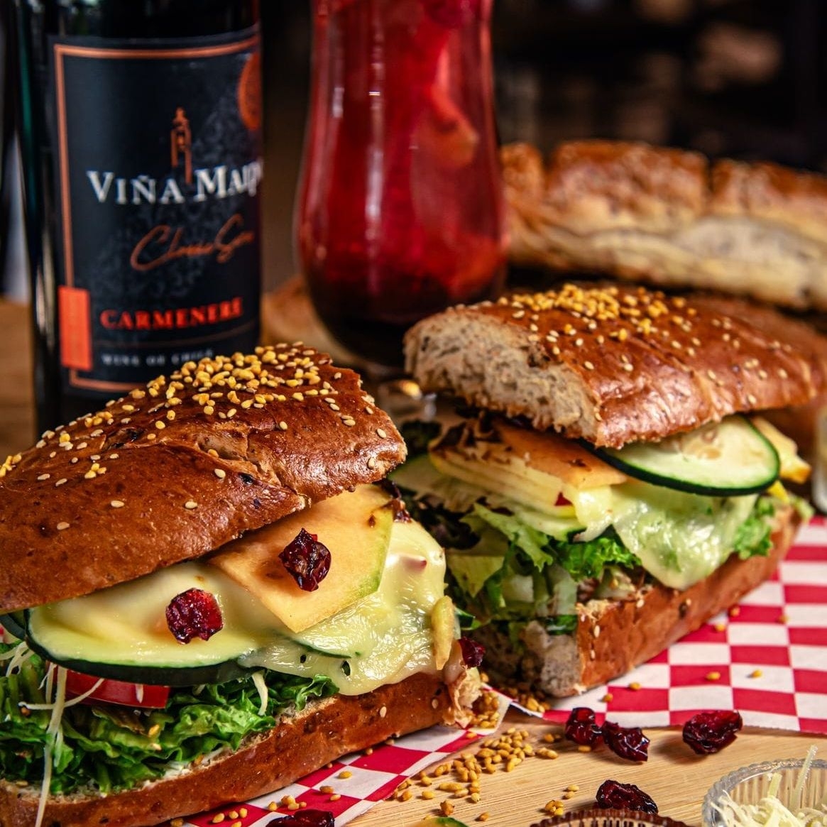 Pan de centeno con pasas, nuez, ajonjolí, lechuga sangría, jitomate, cebolla, mayonesa y queso parmesano.