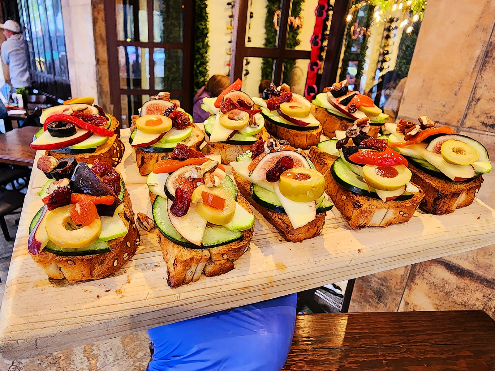 10 pz Pepino, pera, manzana, melón, nuez, arándano, aceituna negra, queso parmesano y queso crema a las finas hierbas. 1 rodaja