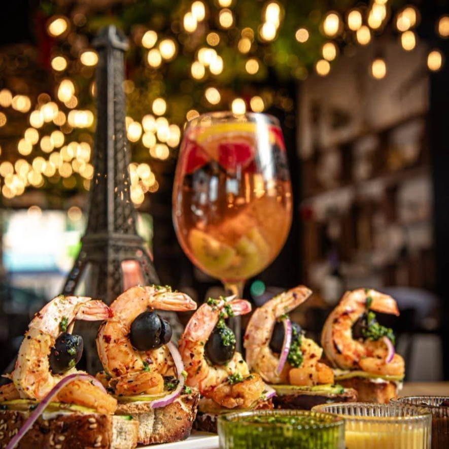 5 Tapas con camarones al ajillo, acompañados de aderezo de mango habanero.
