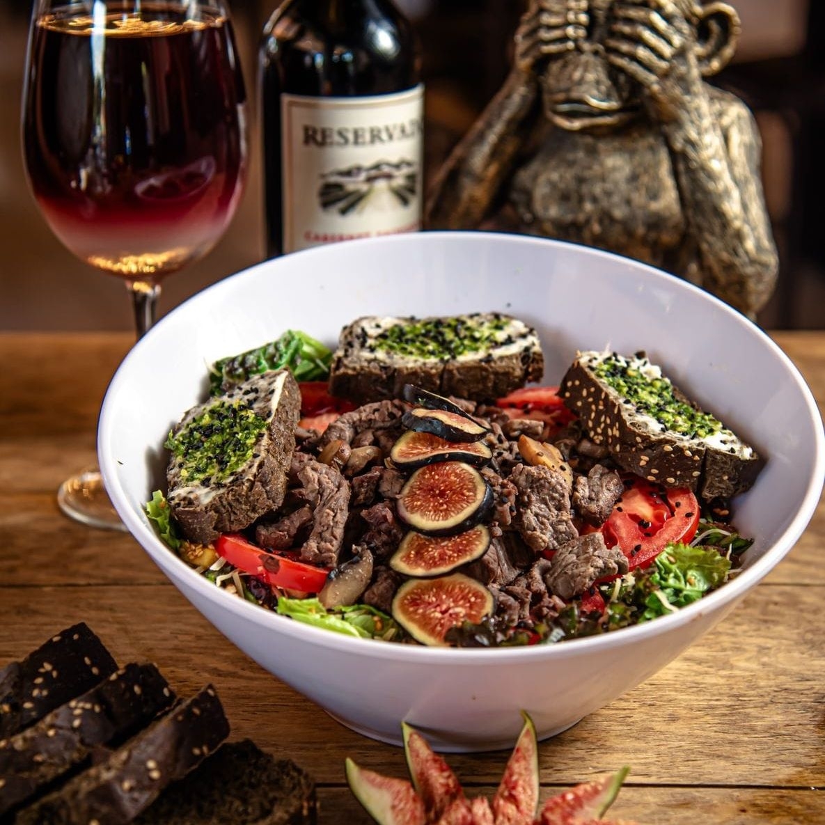Salami, roaste beef y panceta, lechuga sangría, pepino, pera, manzana roja, nuez, arándanos, jitomate y semilla de sésamo.