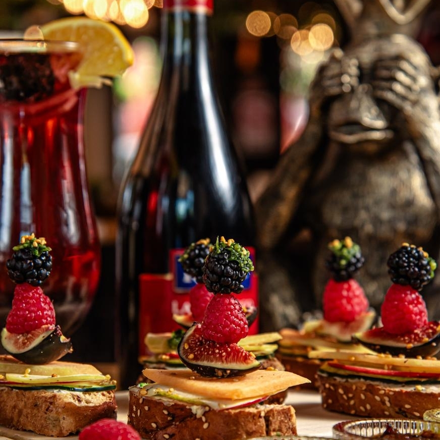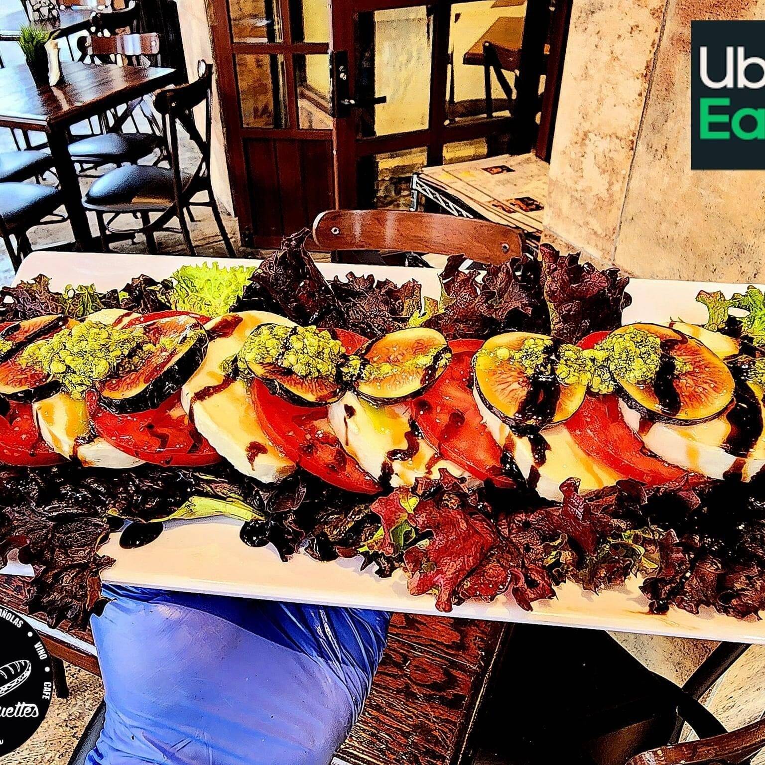 1 Baguette de 4 ingredientes, 2 tapas de jamón serrano, 2 tapas de camarón al ajillo, 2 tapas dulces de arándanos y carnes frías.