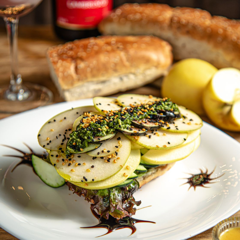 Orden de 5 rodajas de pan de centeno con queso crema a las finas hierbas y aderezos variados.