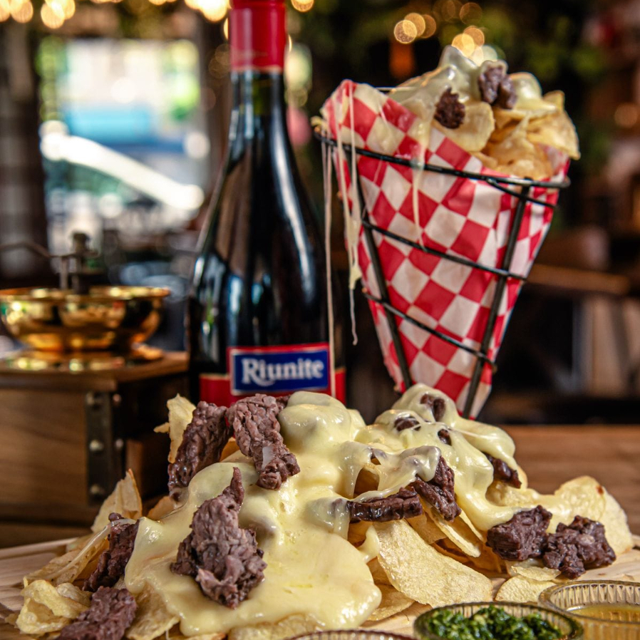 Crujientes papas hojuela cubiertas con tiras de arrachera sazonada a la plancha.