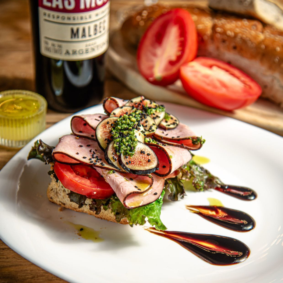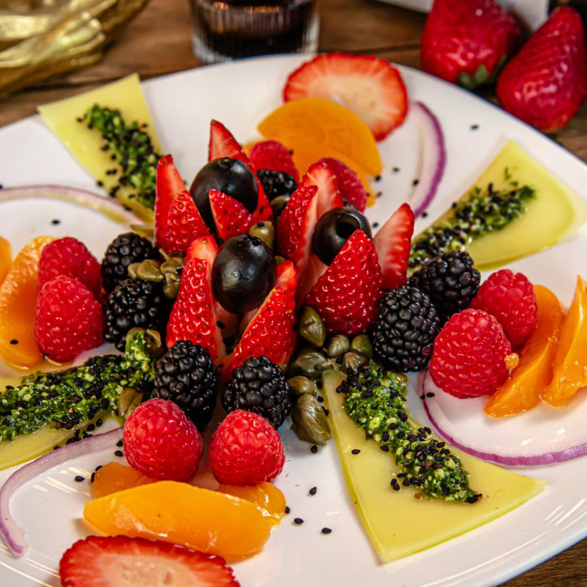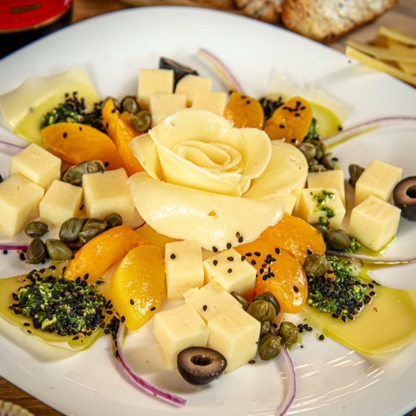 Jamón serrano, roast beef, selva negra, pechuga de pavo, lomo canadiense, quesos, frutos, nueces y pesto.