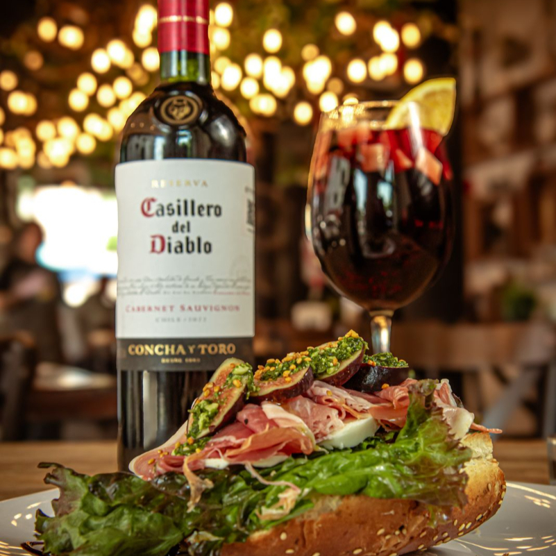 1 Baguette partida en 4, 2 tapas jamón serrano, 2 tapas vegetarianas, 2 tapas camarón, 2 tapas dulces, frutas, nueces y quesos.