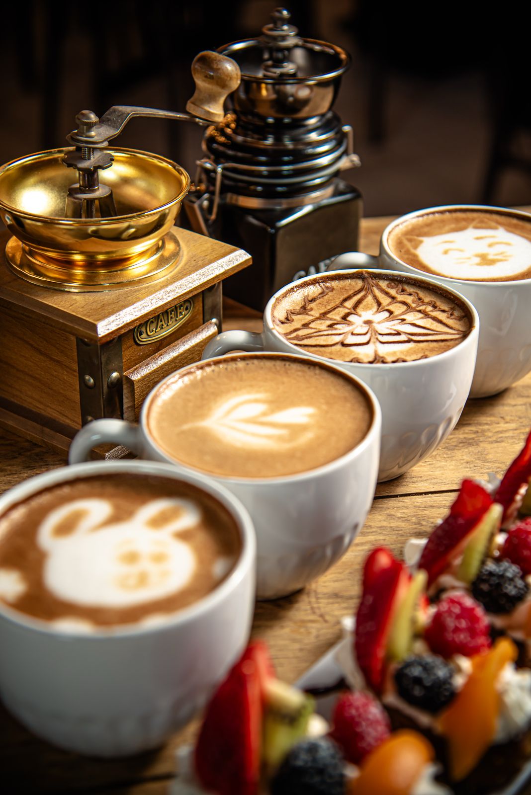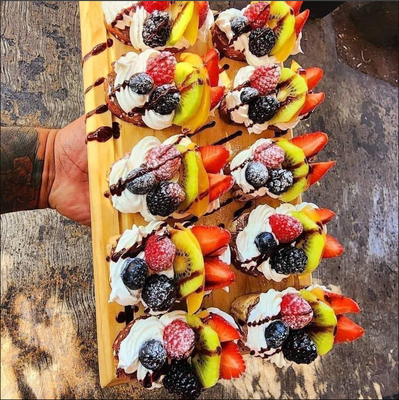 Nutella, crema batida, frutos rojos, kiwi, Hershey's de chocolate o fresa, azúcar glass y granillo Turin.