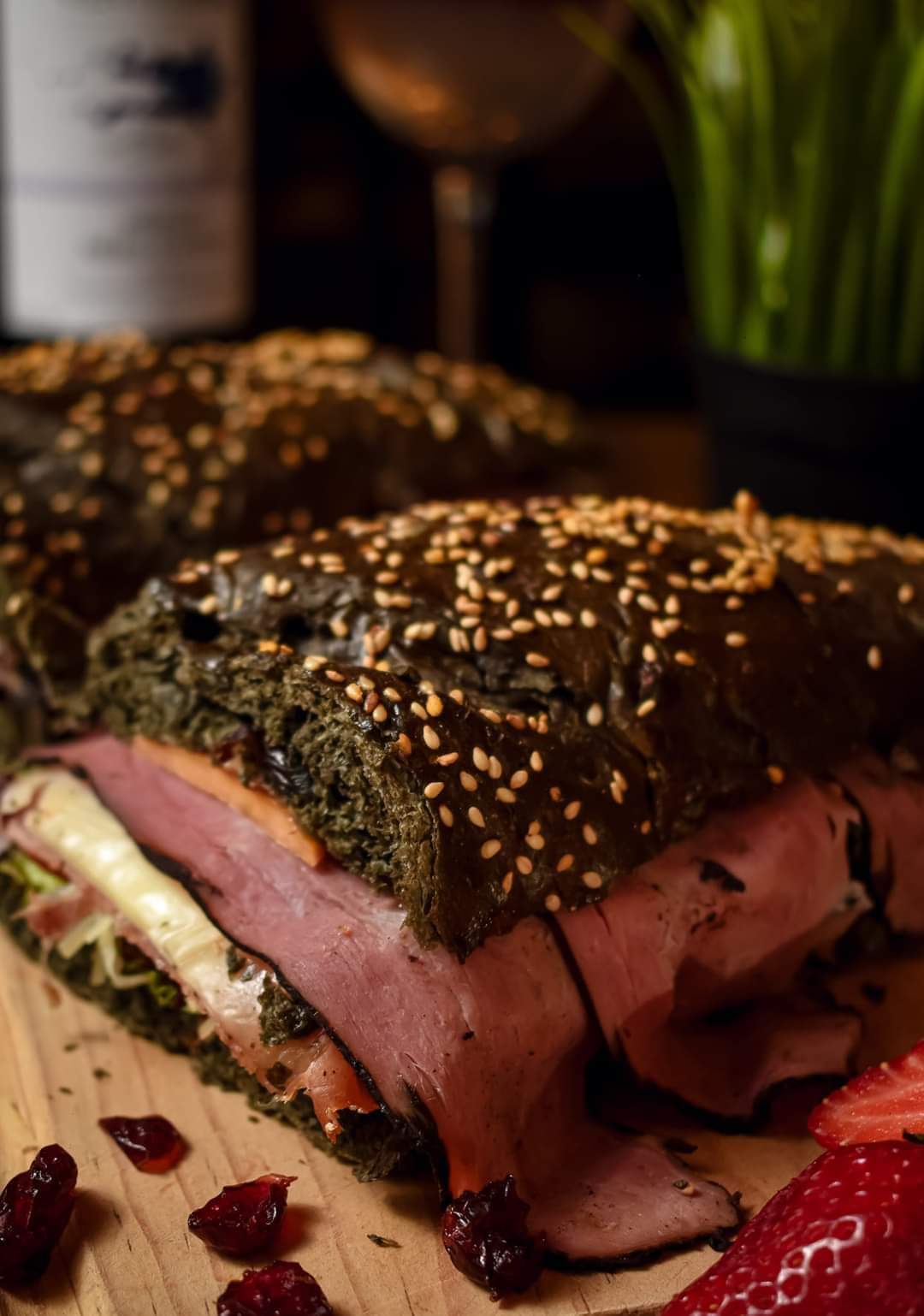 Salami, roaste beef y panceta, lechuga sangría, pepino, pera, manzana roja, nuez, arándanos, jitomate y semilla de sésamo.