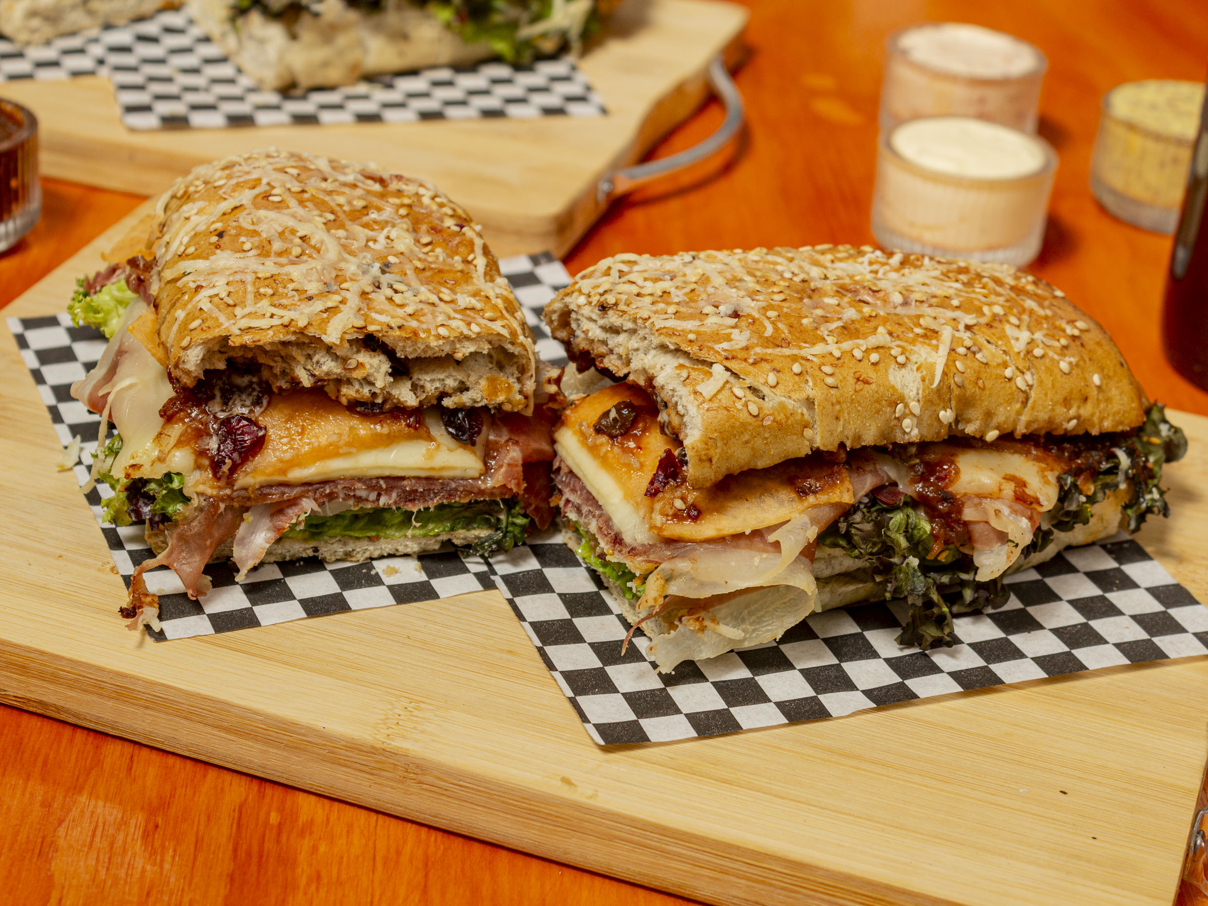 Roast beef con pastrami, media baguette de nuestro pan de centeno, salsa de tomate, queso mozzarella y queso parmesano.