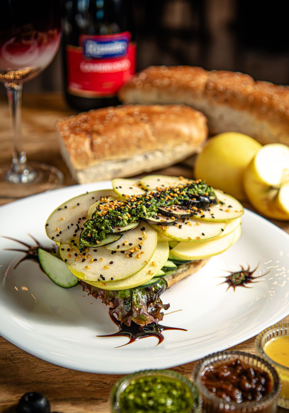 rodaja de pan de centeno con queso crema a las finas hierbas, pesto de albahaca, chipotle dulce y queso.