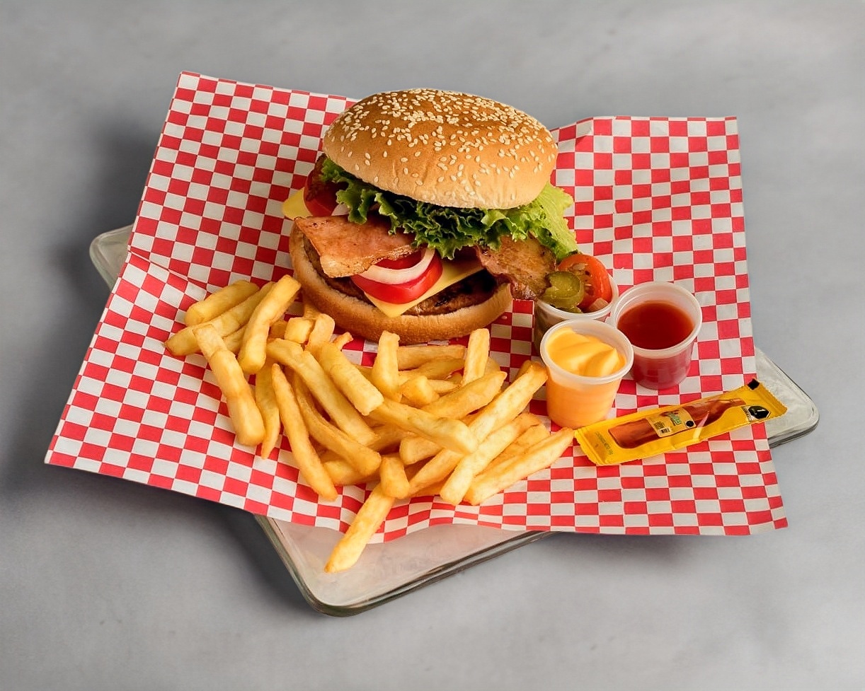Hamburguesa con Tocino y Papas