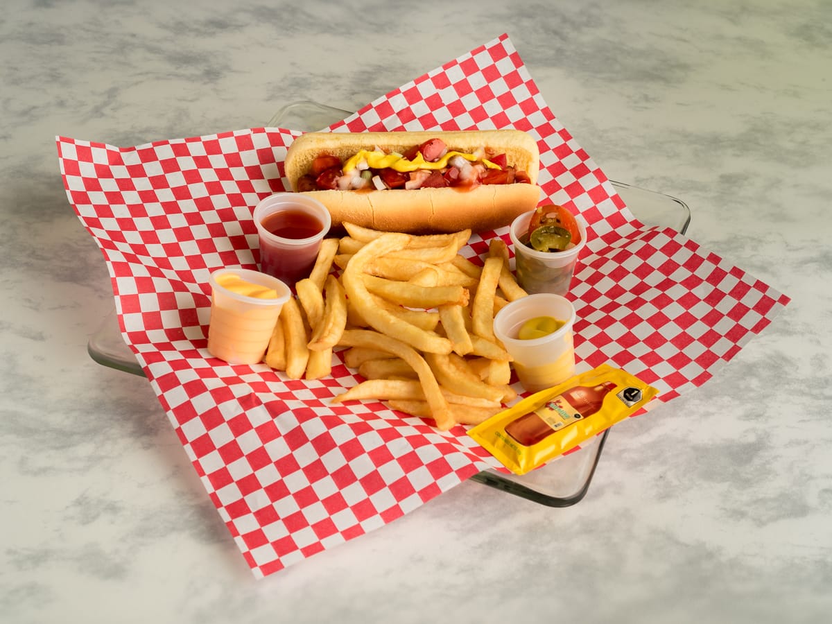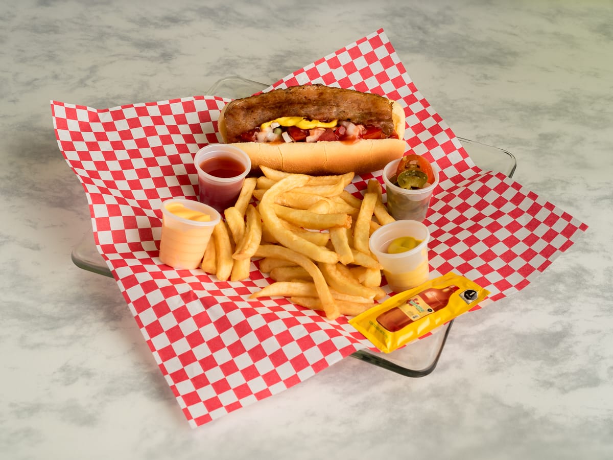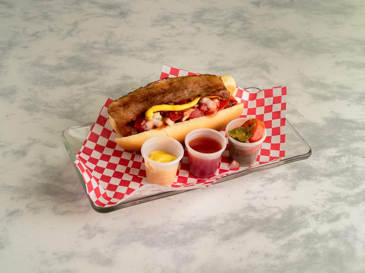 1 Hot-dog con salchicha, carne molida, tocino, jitomate y cebolla caramelizada , mostaza , salsa catsup,salsa BBQ y chiles jalapeños.