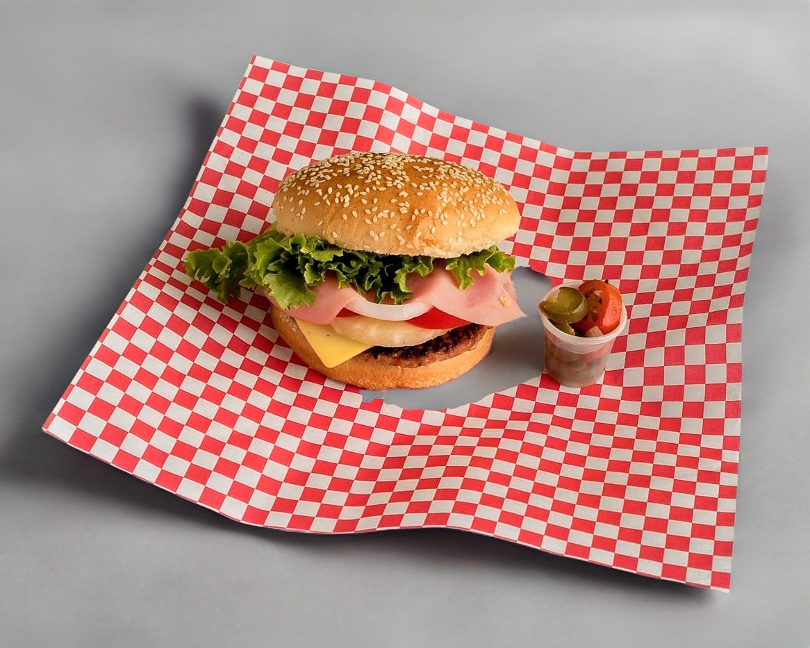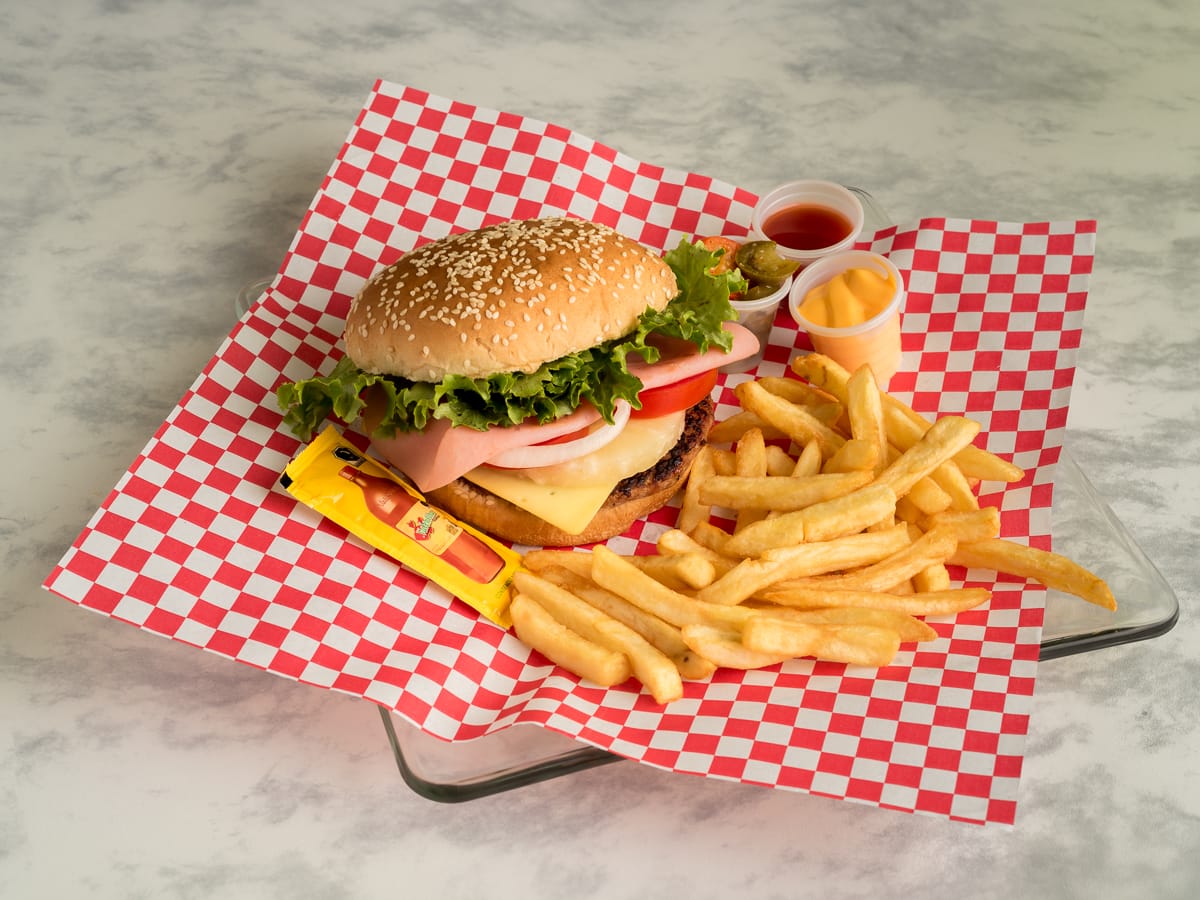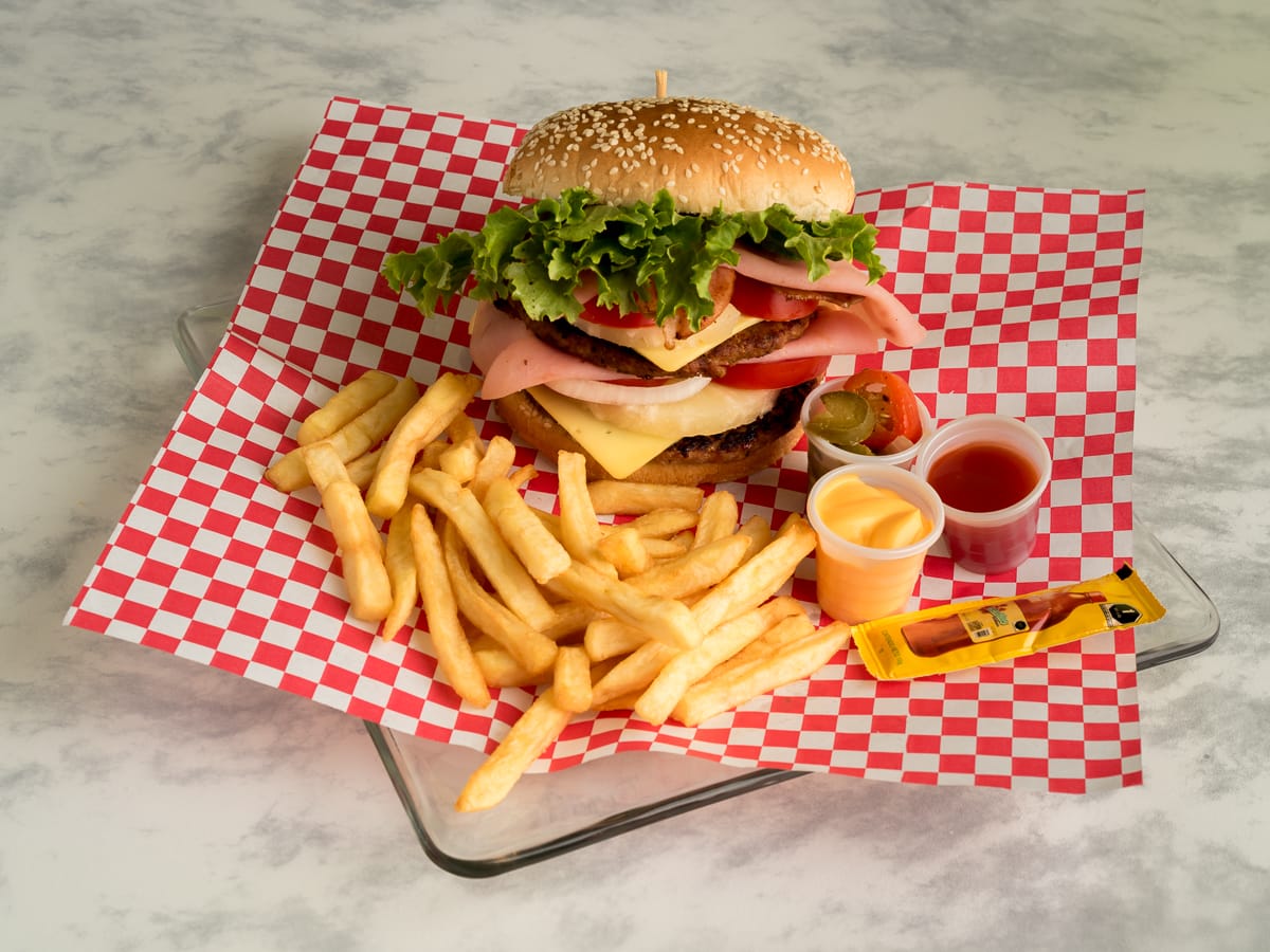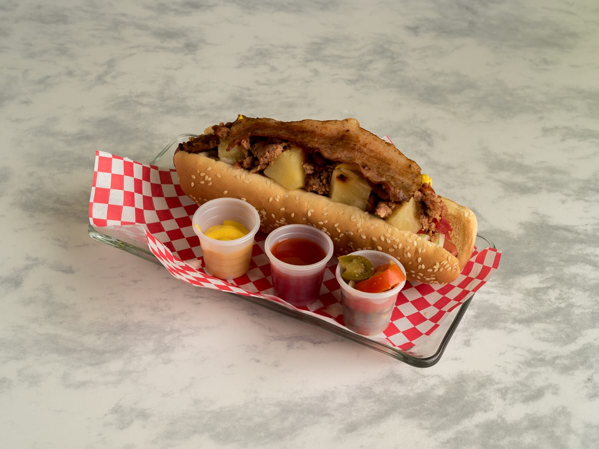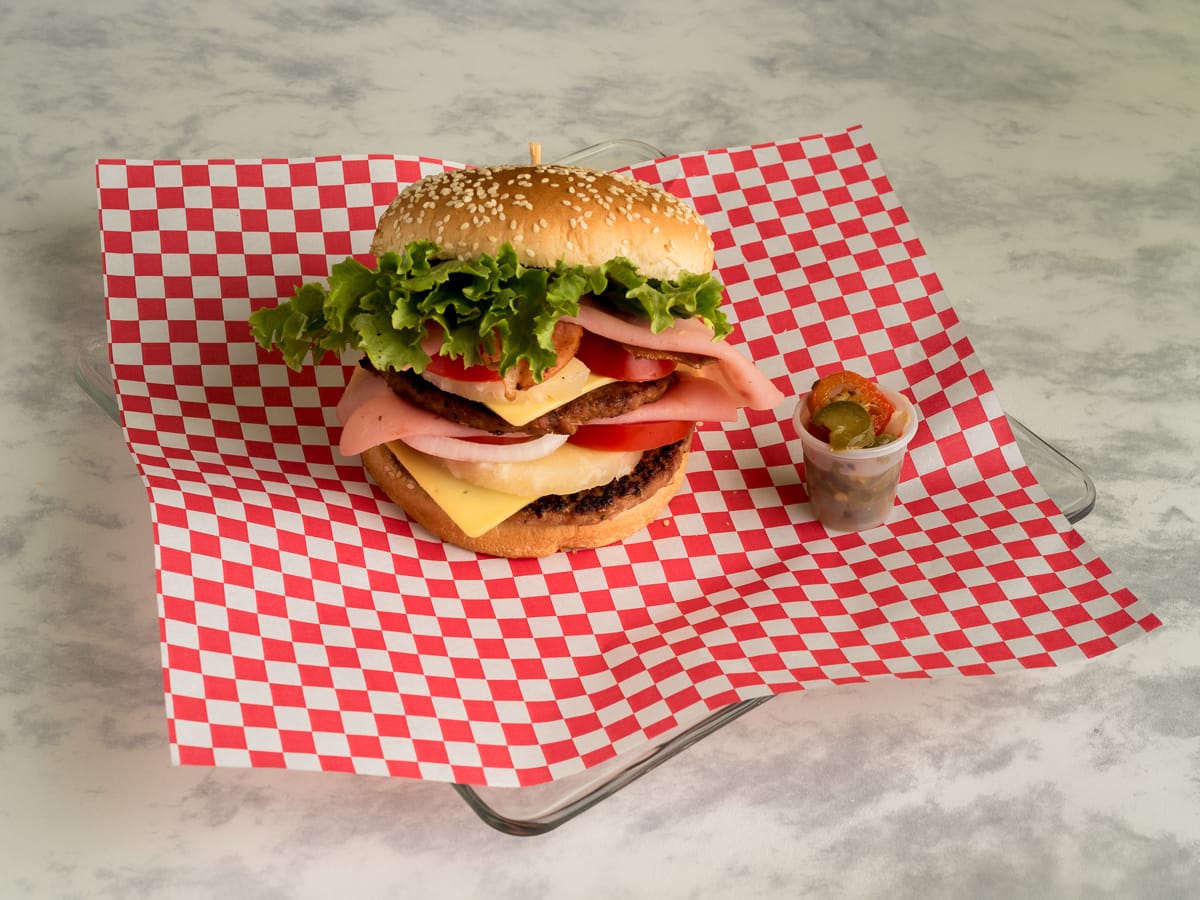 Doble carne de res acompañada con salsa BBQ, piña, queso manchego, jamón, cebolla caramelizada, jitomate, lechuga, cátsup.