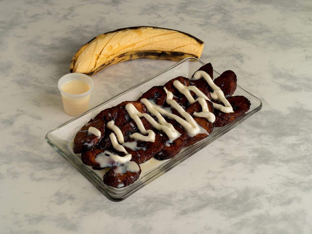 Unos ricos plátanos fritos preparados con mermelada, crema, lechera y chispitas de colores.