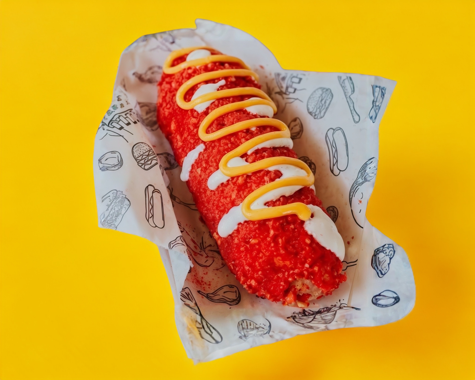 Banderilla de queso y salchicha cubierta de cheto Flaming Hot