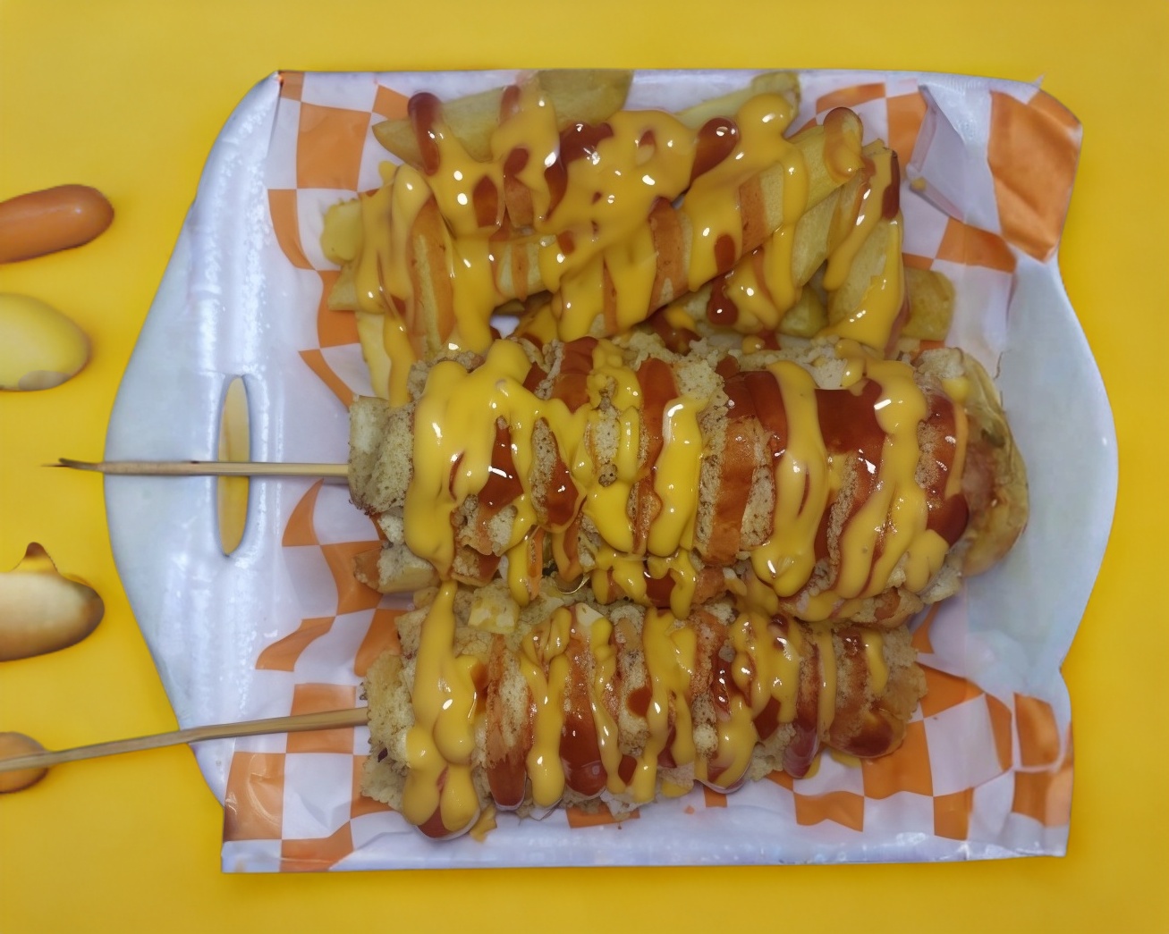 2 Banderillitas de queso y salchicha coreanas acompañadas de papas a la francesa