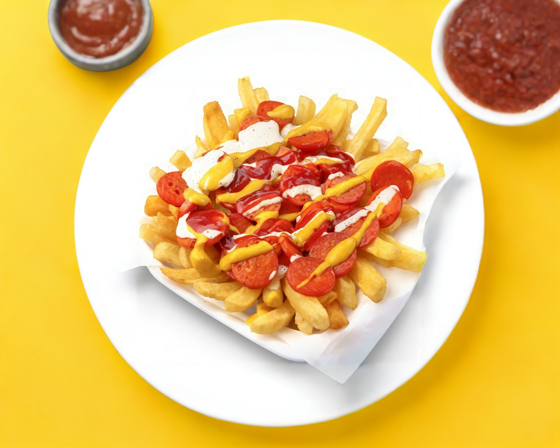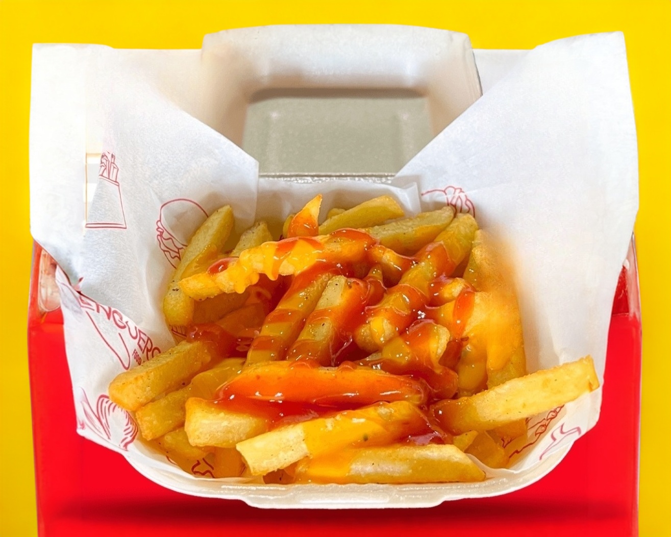 Papas a la francesa acompañadas de salchipulpos catsup y queso