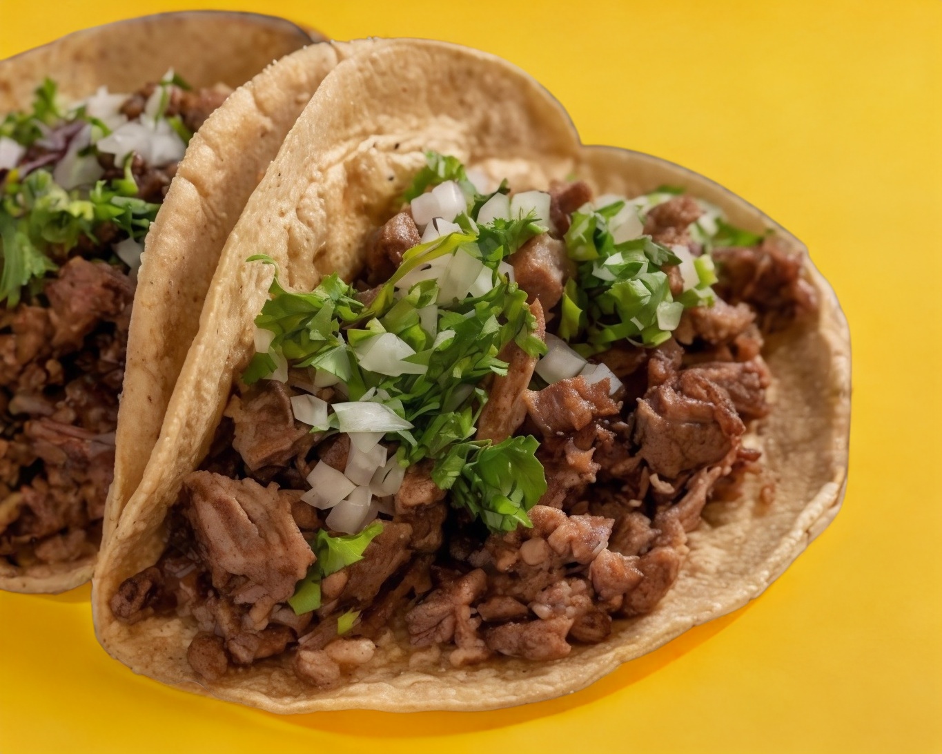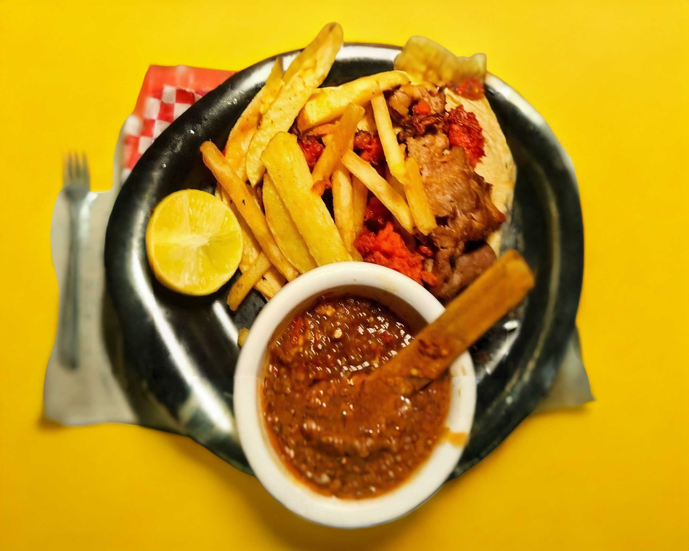 Gran taco con 100 g de la carne de tu elección, acompañado de papas a la francesa y salsa hecha a mano.