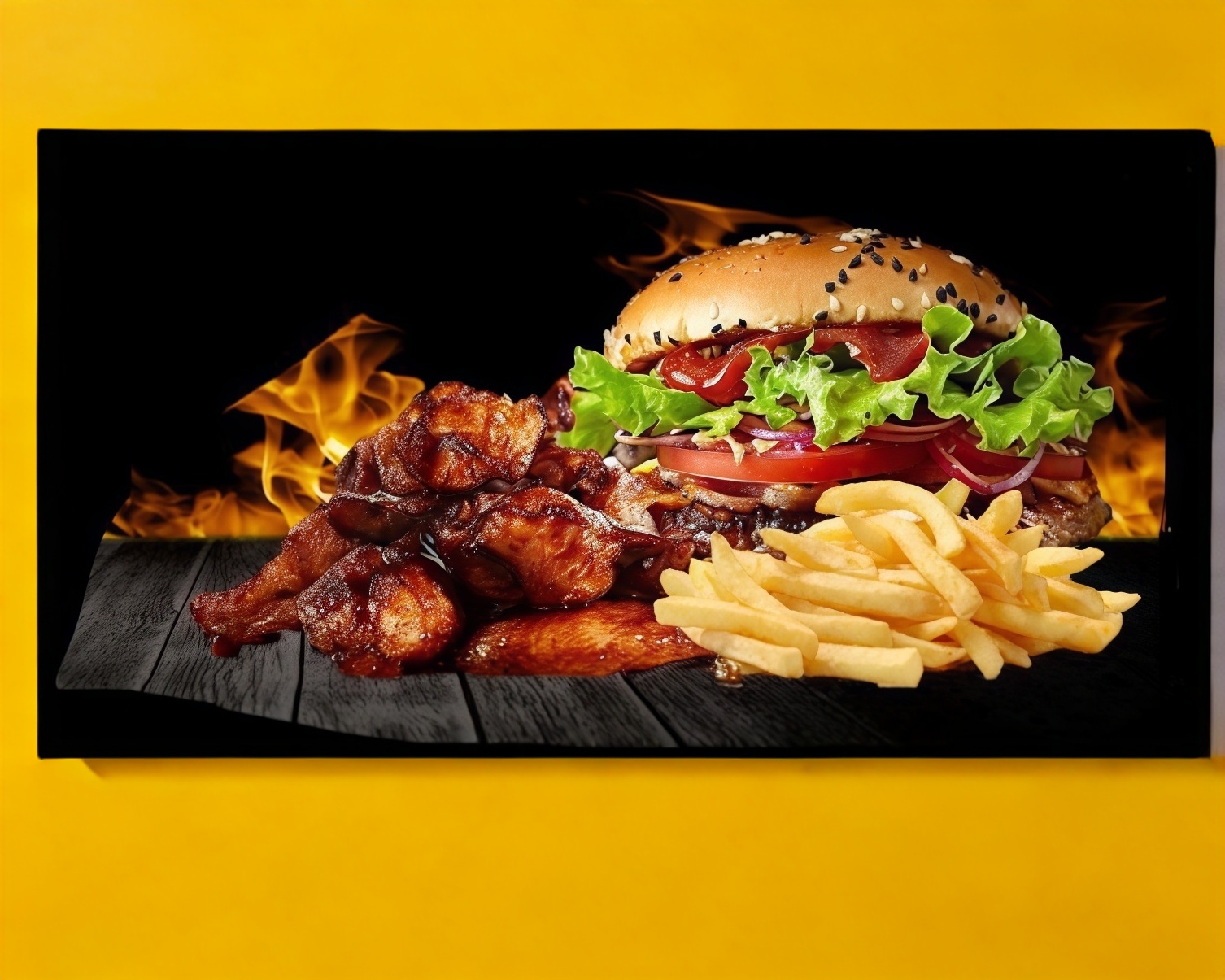 Media orden de alitas (4 pzas), 2 ordenes de papas a la francesa, 1 hamburguesa de pollo y 2 latones de cerveza 455 ml