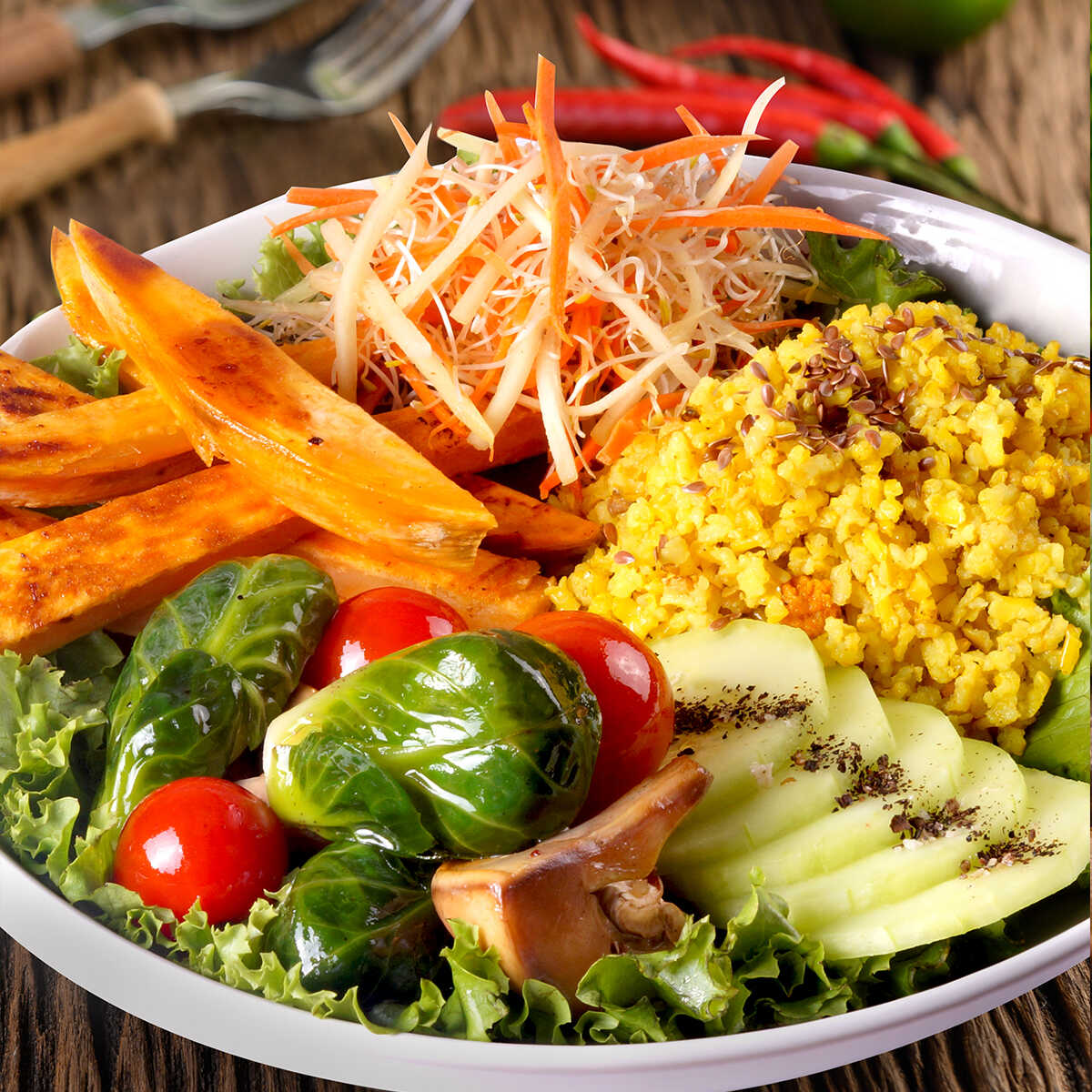 Lechuga, espinaca, arroz al curry con linaza, pepino, coles de Bruselas, hongos salteados, camote horneado, julianas de zanahoria y chayote. Acompañado con aderezo de yogurt al cilantro.