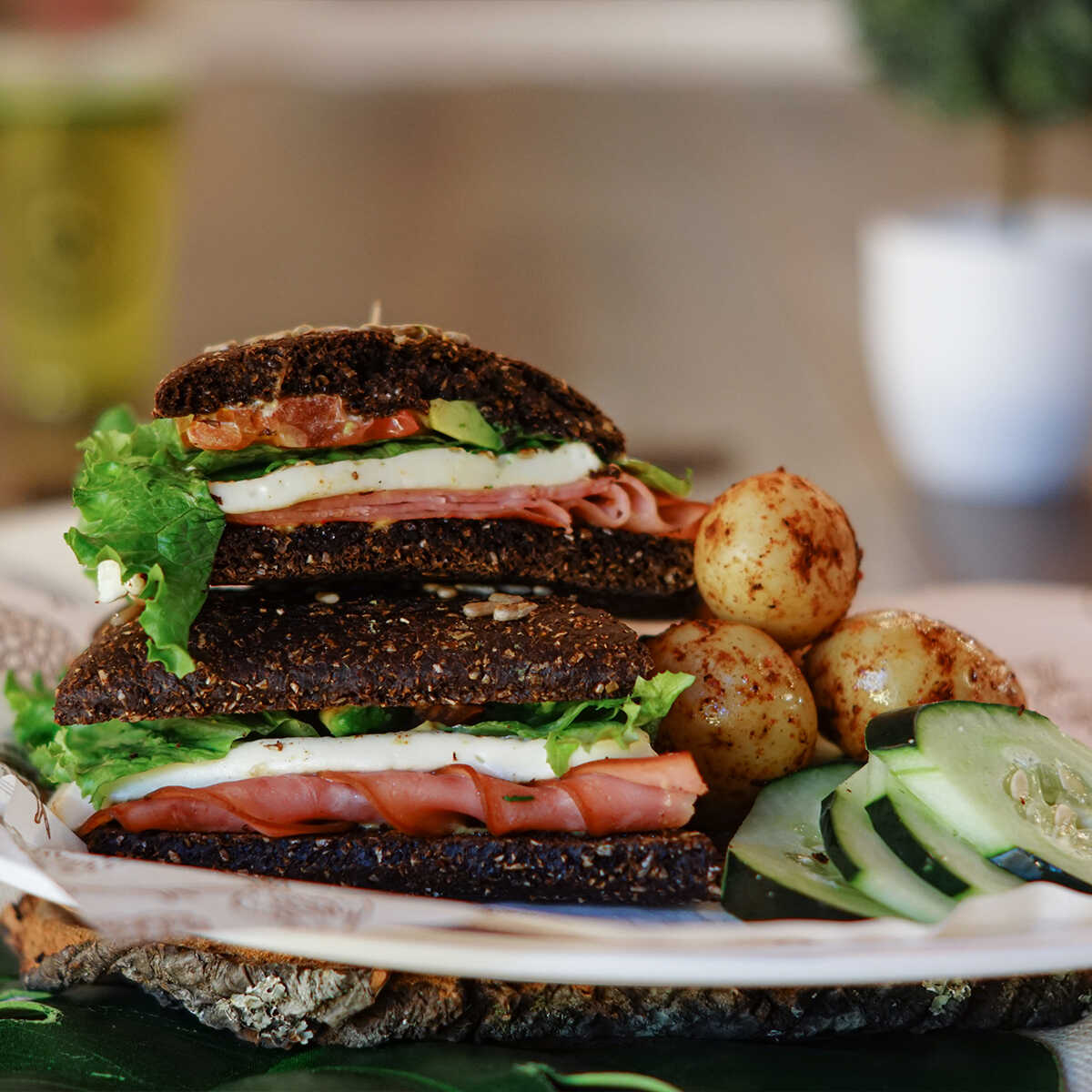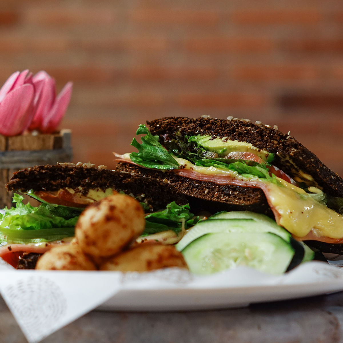 Crujiente; con queso gruyère, jamón de pavo, lechuga, aguacate y jitomate.