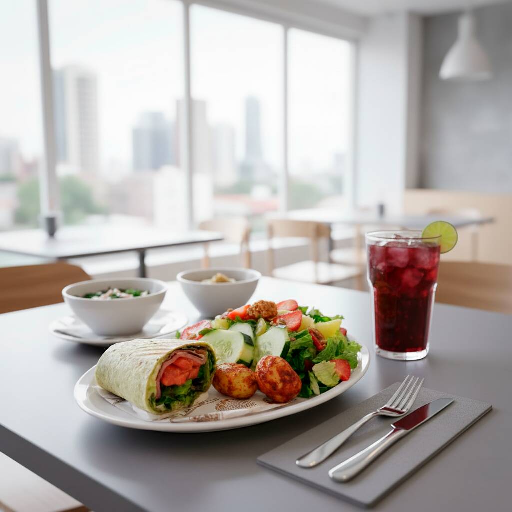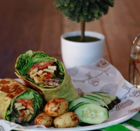 Medio Wrap campirano, media ensalada la mongo y un agua fresca (500ml) de tu elección: Melón, mango, jamaica, fresa, piña, papaya, sandía, limoncito, limón con chía o piña con perejil.