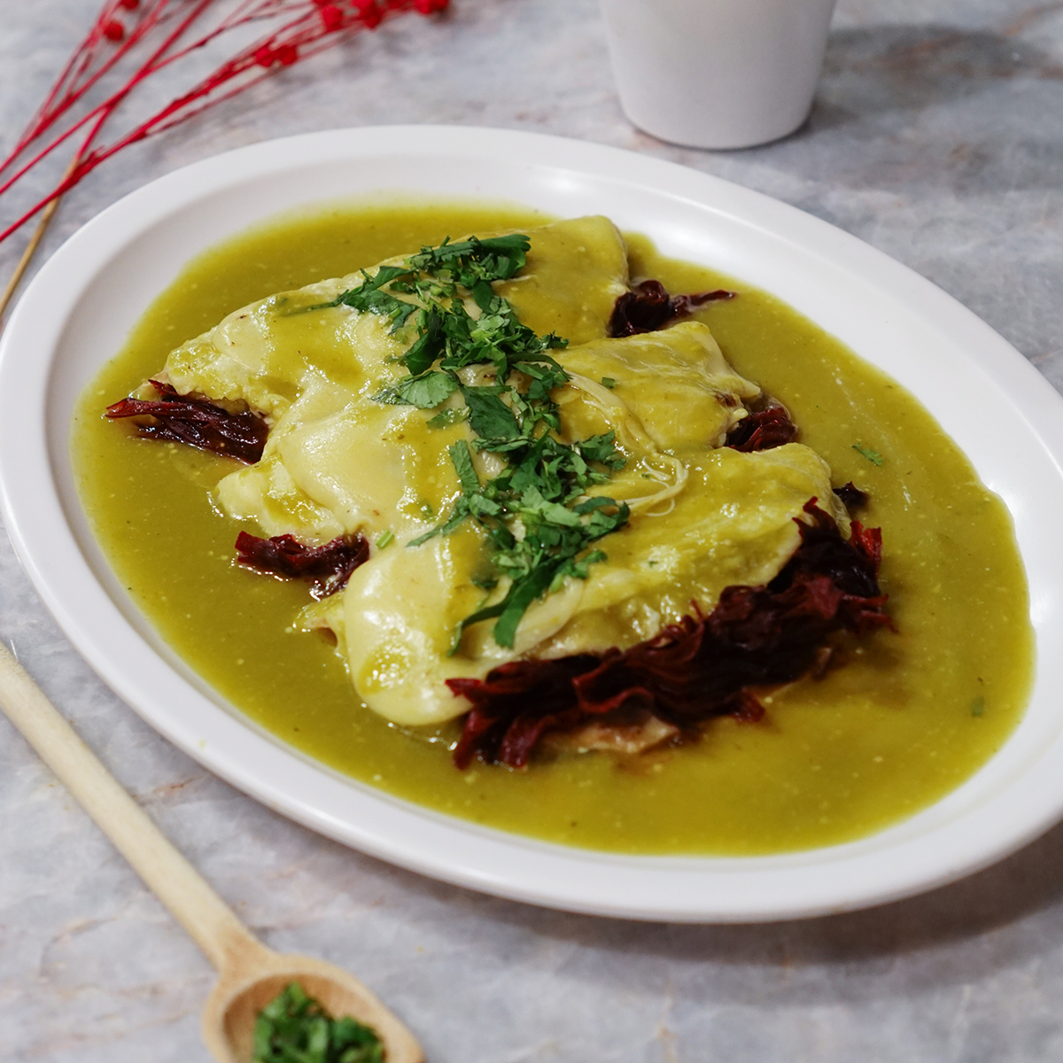 Enchiladas de requesón con chile poblano preparadas con tortillas de nopal; acompañadas de lechuga, aros de chile guajillo, cebolla morada, aguacate y salsa mexicana. Te darán mucha energía.
