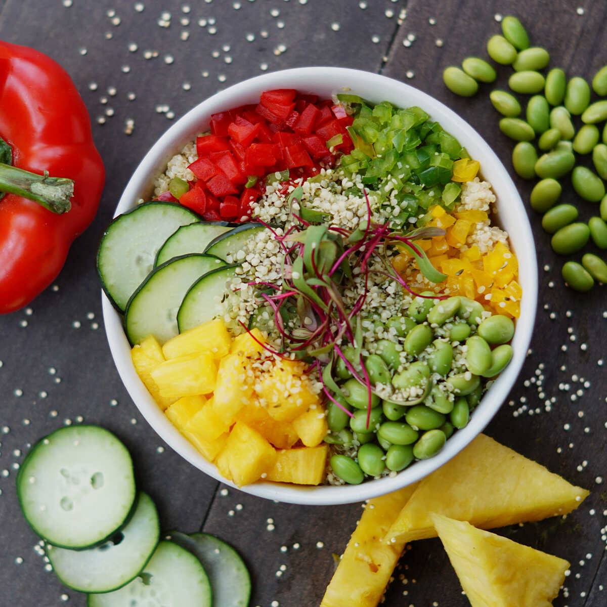 DELICIOSA QUINOA , MEZCLA DE PIMIENTOS TRICOLOR , PIÑA PEPINO , HEMP Y EDEDAME