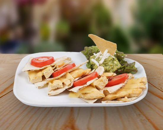 Pechuga de pollo deshebrada y adobada con frijoles, aguacate, jitomate y lechuga; gratinado con queso manchego.