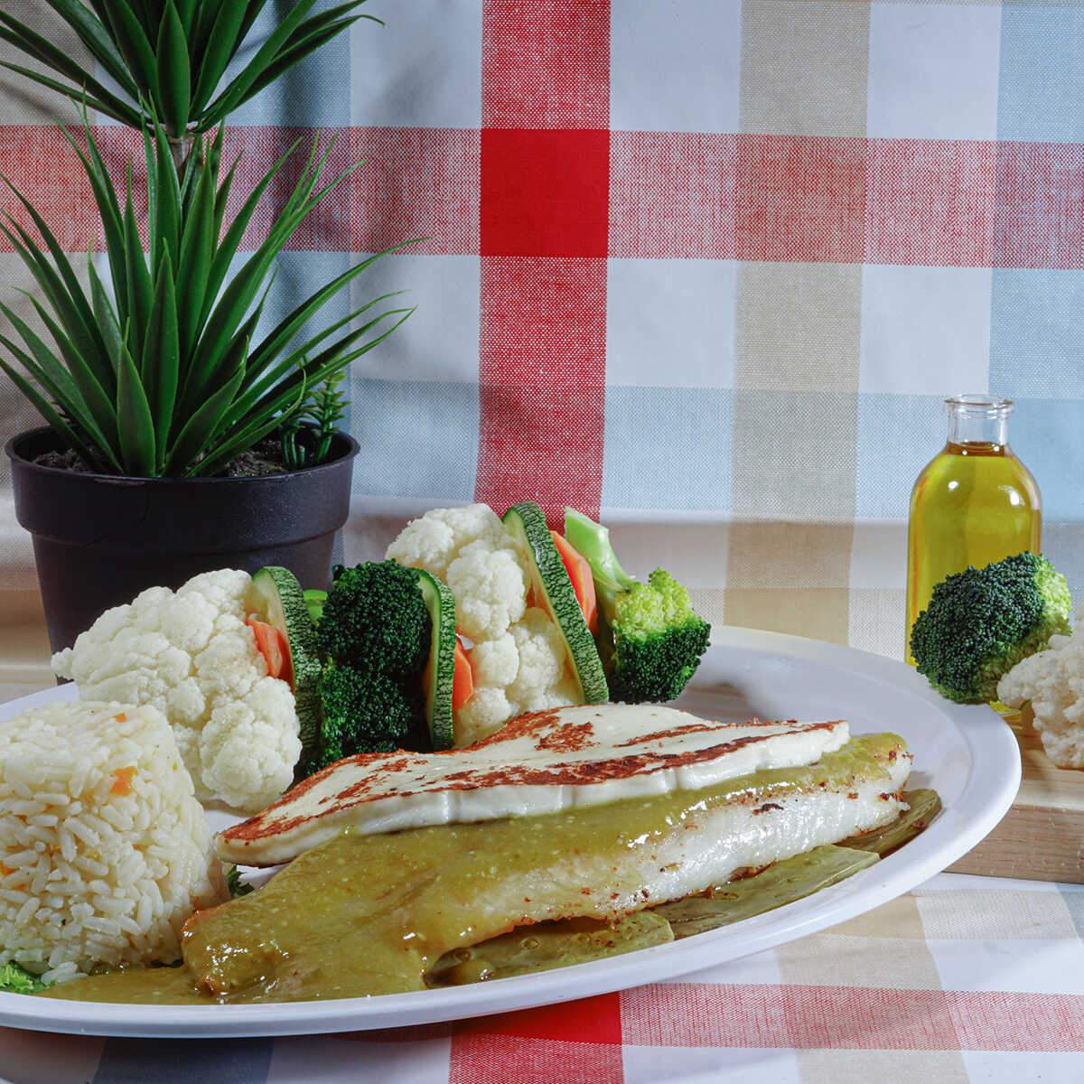 ¡La especialidad de la casa! Filete de pescado a la plancha montado sobre una cama de nopales asados, bañado con salsa verde y gratinado. Servido con arroz y verduras.