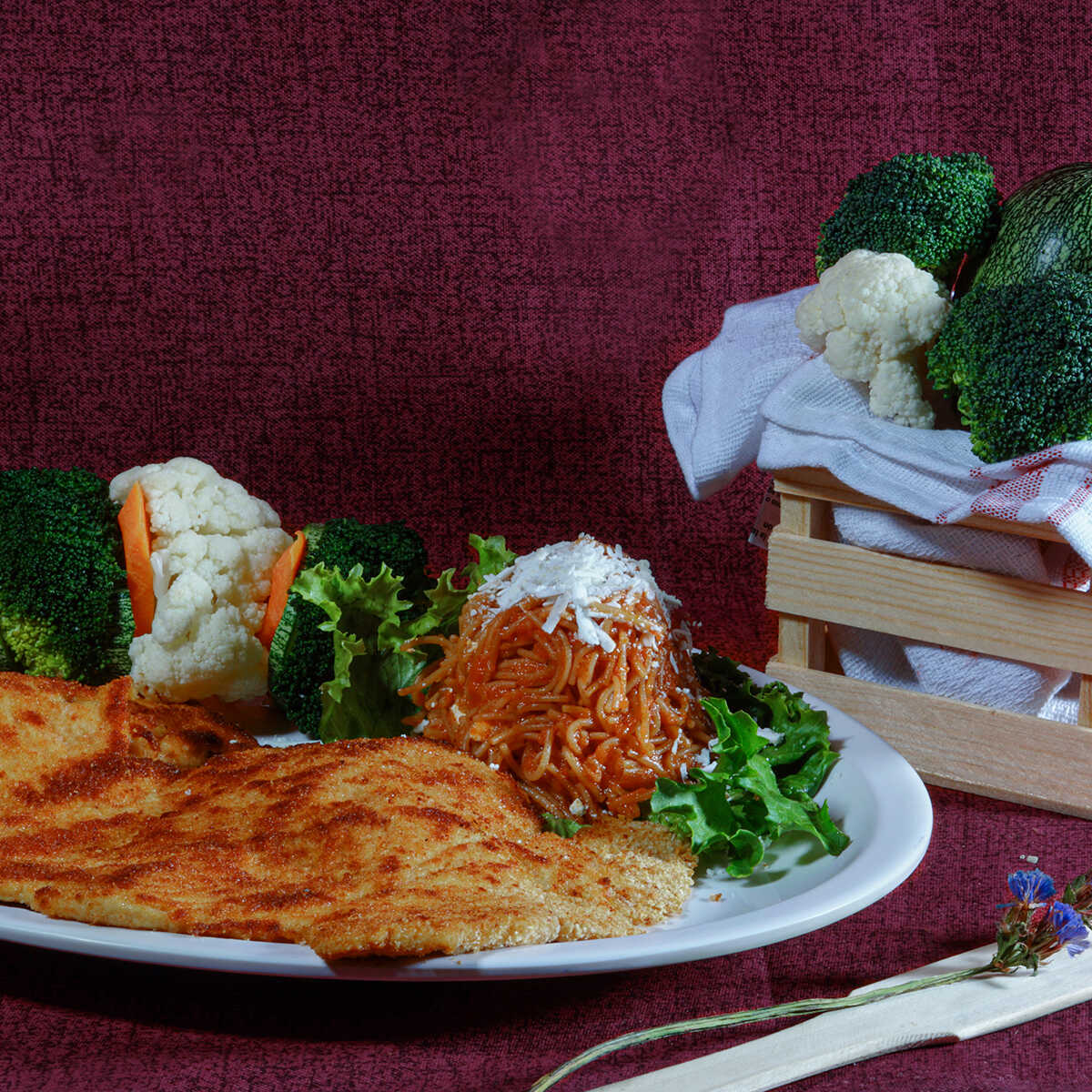 La empanizamos con pan integral y la acompañamos con fideo seco al chipotle y verduras al vapor.