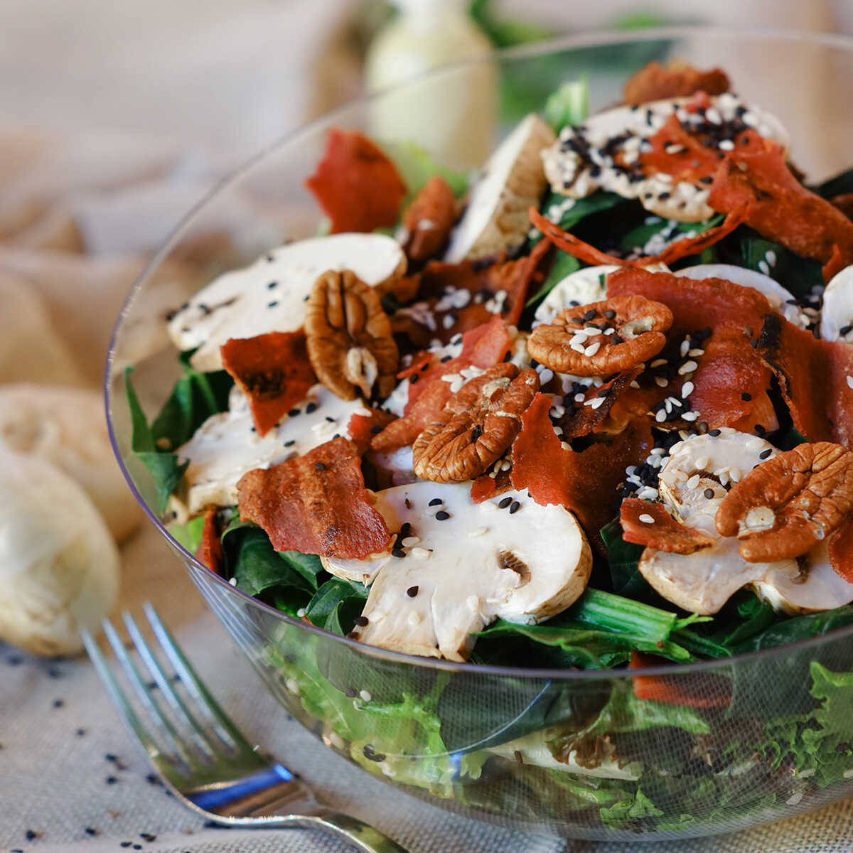 Tiernas hojas de espinacas y lechugas, tocino de pavo, champiñones, nuez, ajonjolí blanco y negro; con aderezo de miel y mostaza.
