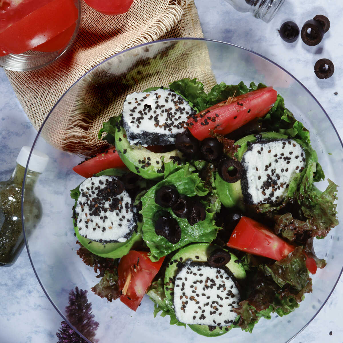 Deliciosa combinación de lechugas, aguacate, ajonjolí negro y queso de cabra ceniza; con aderezo a las finas hierbas.