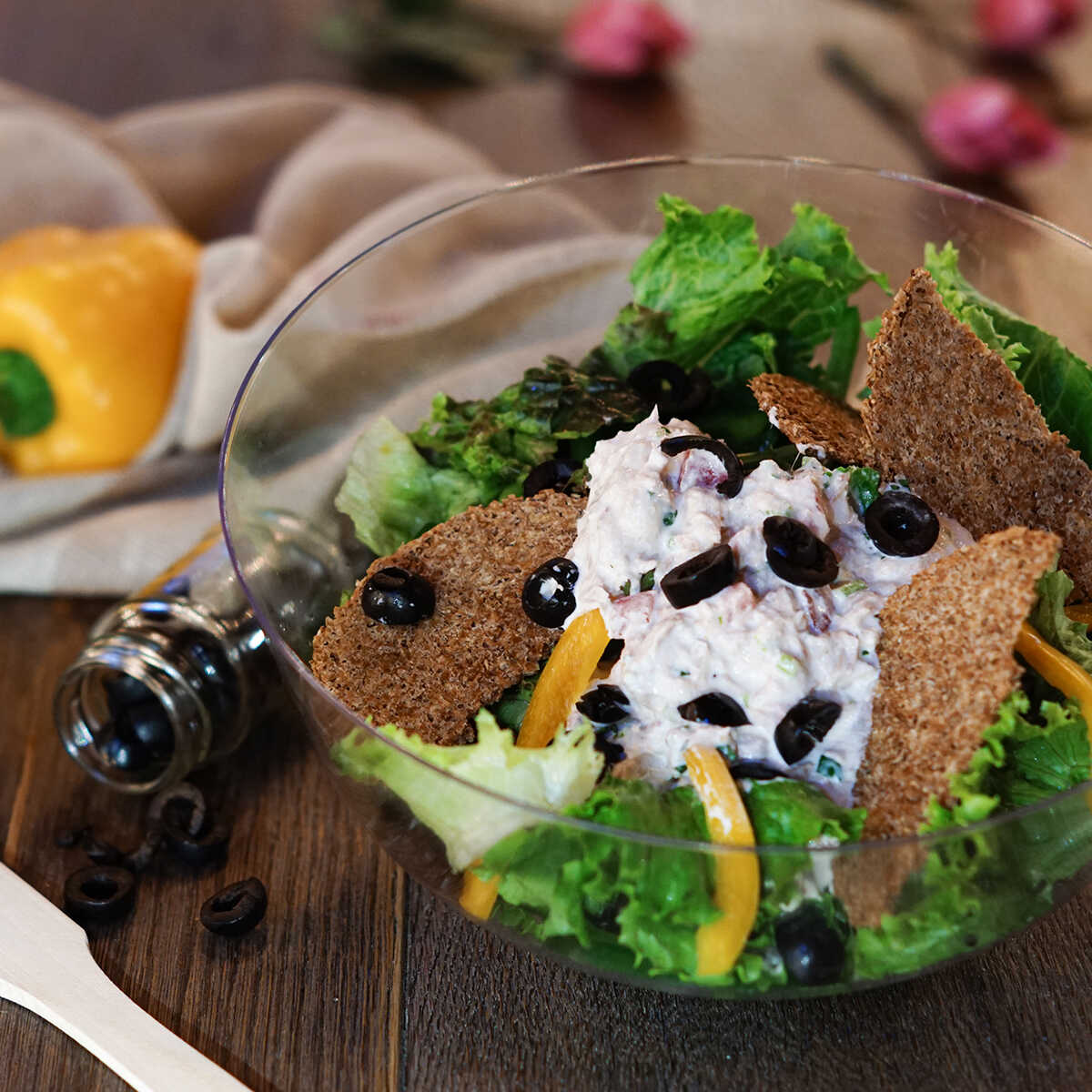 Atún aleta amarilla preparado con jitomate, cilantro y cebolla; perfectamente sazonado con mayonesa acompañado con tostaditas integrales.