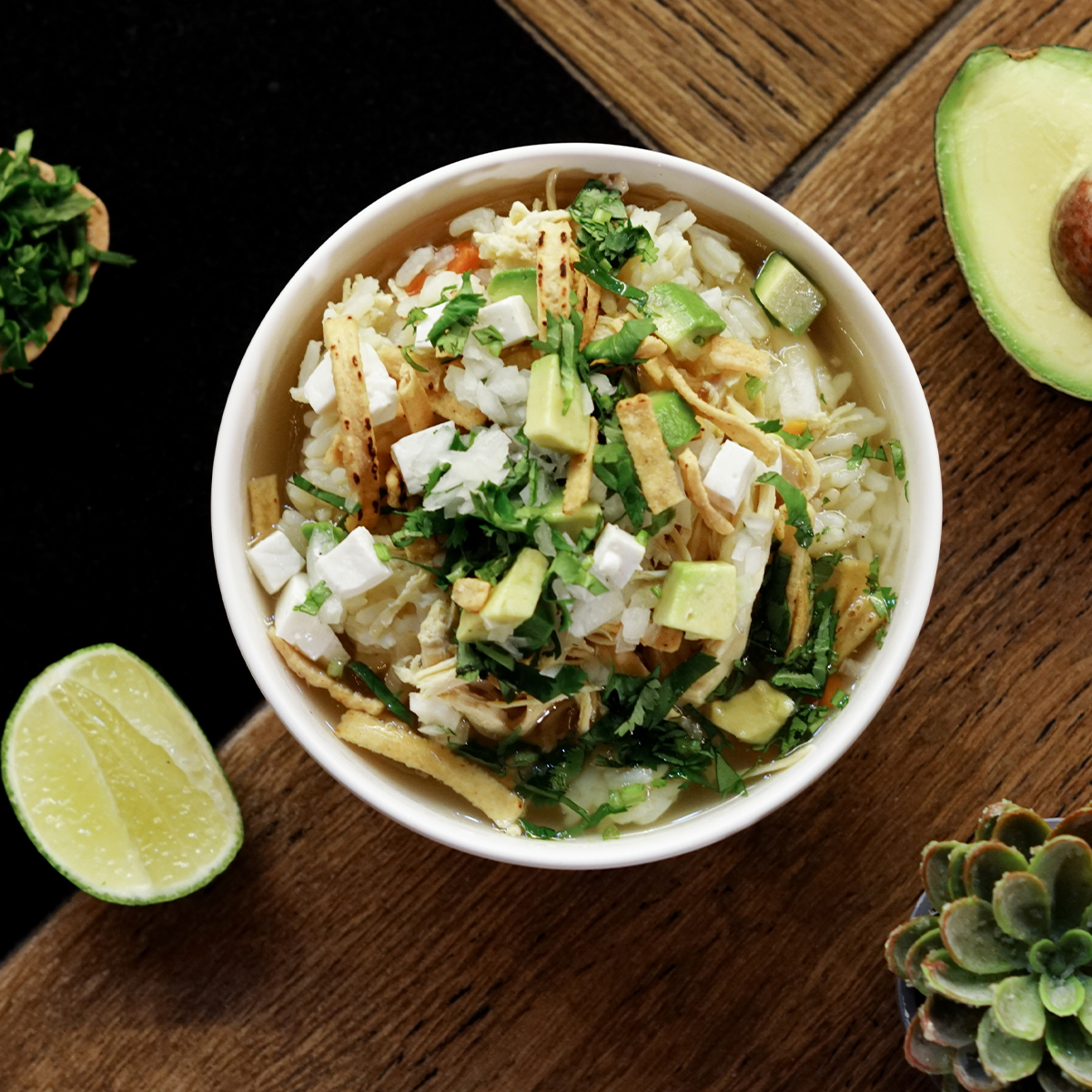 Consomé de pollo, con arroz y pollo desmenuzado; acompañado con totopos, aguacate, queso panela, cebolla, cilantro y chile serrano.
